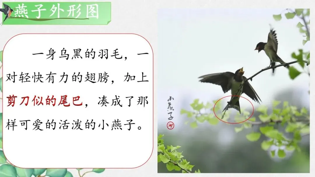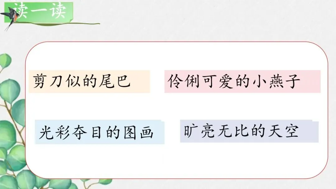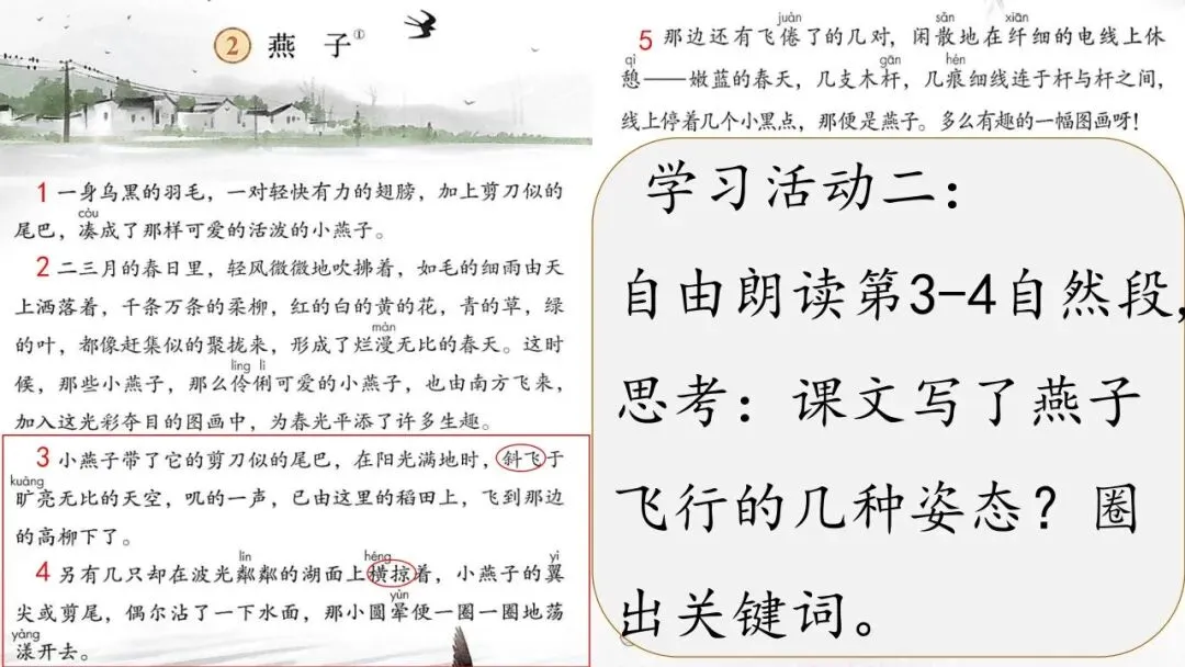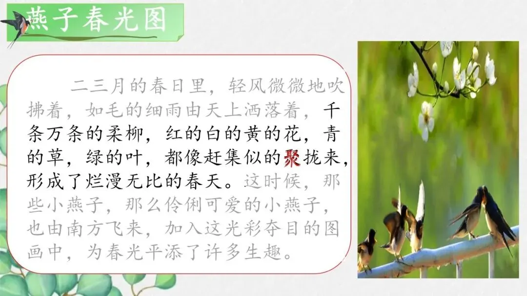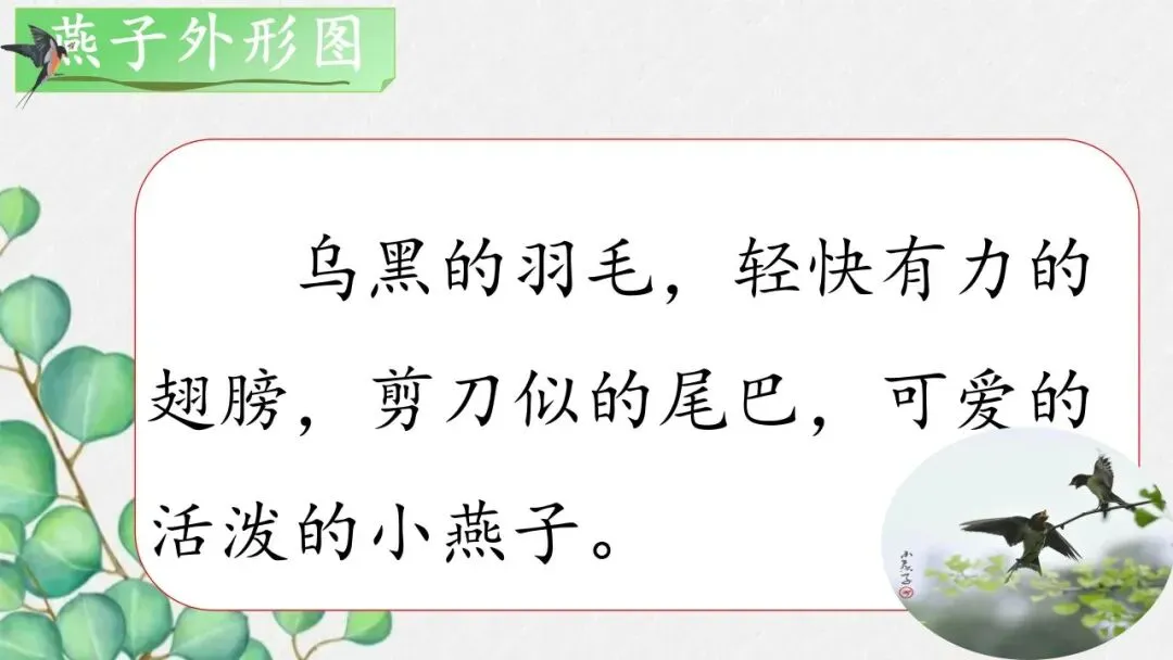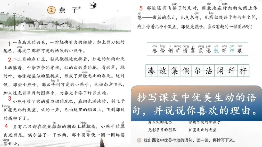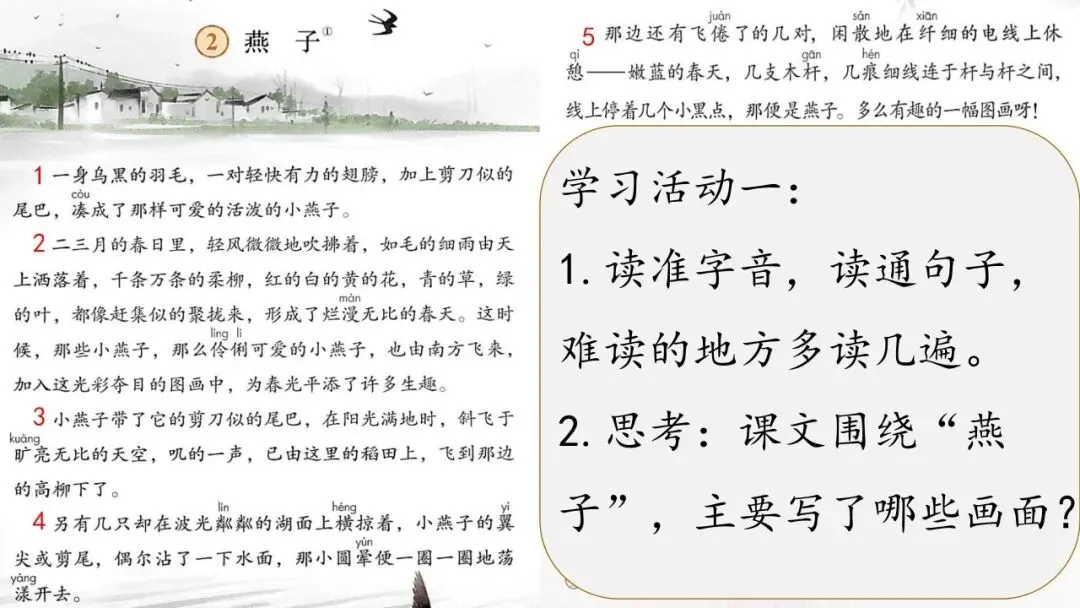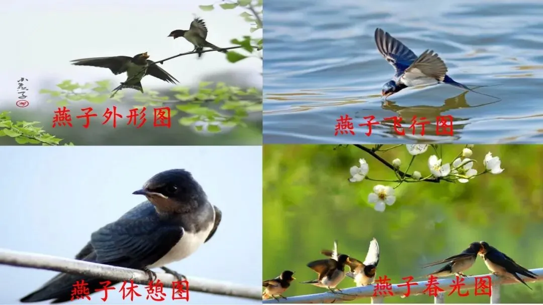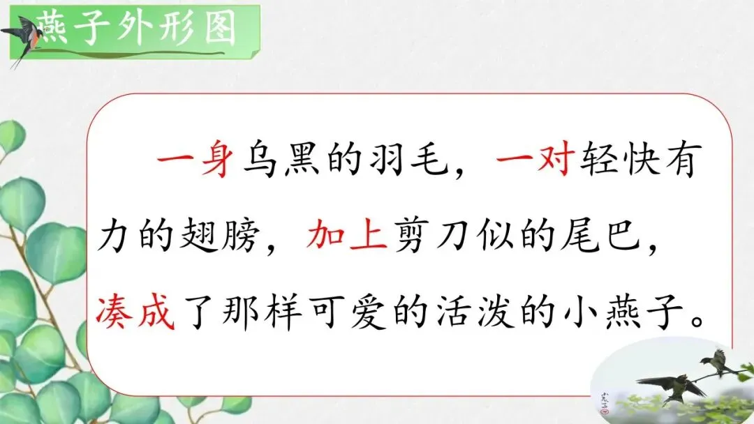 2.燕子教学目标:1.认识“凑、伶”等12个生字,读准多音字“散、杆”,会写“乌黑、活泼”等15个词语。 2.边读课文边想象画面,读出对燕子的喜爱之情。背诵第1~3自然段。 3.积累“剪刀似的尾巴”等词语,体会文中优美生动的语句并摘抄。 教学重难点:边读课文边想象画面,读出对燕子的喜爱之情。背诵第1~3自然段。 教学准备:ppt课件 教学课时:2课时 第一课时教学目标:1.认识“伶、俐”等12个生字,借助常用词语正确区别并读准多音字“散、杆”;会写“凑、泼、倦”等横画较多的字。正确读记“伶俐可爱、光彩夺目”等词语并延伸拓展类似的词语。 2.正确流利有感情地朗读课文。边读边想象画面,体会燕子的外形美和春天的光彩夺目。 3.通过反复有感情朗读、换词等方法,背诵第1、2自然段,积累优美生动的语句。 教学流程: 一、猜谜引人,揭示课题1.指名读谜面。 课件出示谜语:身穿黑眼袍,尾巴像剪刀,冬天去南方,春天又来到。 请同学们猜一猜,这是什么小动物?(出示:燕子) 2.你觉得这是一只怎样的燕子?学生交流。老师感受到大家都很喜欢小燕子,有一位著名作家郑振铎也特别喜欢燕子,写了这样一篇文章来赞美它!今天我们就来学习这篇课文吧。让我们来一起来读读课题。课件出示题目。 二、初读课文,整体感知1. 出示学习要求,请同学们自由读课文,并思考问题。 课件出示: 学习活动一: (1)读准字音,读通句子,难读的地方多读几遍。 (2)思考:作者是从哪几个方面来介绍燕子的? 2.检查字词 (1)出示认读词语。 课件出示: 横掠剪刀似的伶俐可爱闲散飞倦轻快有力 木杆几痕纤细旷亮无比波光粼粼 (2)检查生字的认读情况。 开火车读,去拼音读。 注意多音字“散”“ 杆 ”的读音: “散”在这里读“săn”,表示约束、松开或者零碎的意思;另外还有一个读音“sàn”,组词为“散会”,表示由聚集而分离或分散的意思。 “杆”在文中读“gān”,我们来读读文字的句子,表示长棍子的意思;还有一个读音是“găn”,我们来读读。在这里表示某些器物上细长的棍状部分。 (3)借助作业本,选择正确读音,指名读,读好难读的词语。 课件出示作业本第2题。 观察这两组词语,你有什么发现? 课件出示:发现第一行描写的燕子,第二行描写风景。 小结:烂漫无比的春天里有可爱活泼的小燕子。 3.梳理脉络 这篇课文的每个自然段都是一幅生动有趣的图画,读一读说一说,你看到了哪几幅画面,请同学们边读边想象,抓住关键词语简单概括,完成作业本第五题。 4.引导学生根据课文内容,给图画排序,梳理课文脉络。 (1)出示图片,启发思考。 课文通过文字描绘了一幅幅燕子图,老师也在网上找到相应的图片。你能根据文字找到相应的图片吗?出示四幅图请你看看每一幅图对应的是哪段文字。 (2)那你能根据图片,给图片起一个简单的题目。 燕子外形图 燕子飞行图 燕子休憩图 燕子春光图 学生交流,板书:外形图;春光图;飞行图 ;休憩图 (可让学生结合画面,给画面取名字) 总结:抓住文中的几个关键词,我们就能将课文内容与图片对应起来,找到相关的自然段。 三、边读边想象,感受燕子外形图1.引导:接下来我们就将镜头拉近,来欣赏这幅燕子外形图。 出示句子:一身乌黑的羽毛,一对轻快有力的翅膀,加上剪刀似的尾巴,凑成了那样可爱的活泼的小燕子。 2.请同学们抓住关键词,说一说哪些词语让自己眼前浮现出了一只可爱的活泼的小燕子。 预设1:“剪刀似的尾巴”这个词语用得很好,作者把燕子的尾巴比作剪刀,让我能一下子想到这是一只可爱的小燕子在天空中翱翔。 课件出示:剪刀似的尾巴。 预设2:读了“轻快有力的翅膀”这个词语,我眼前浮现出了一只活泼的小燕子,正扇动着翅膀,快乐地飞翔。 预设3:“乌黑的羽毛”写出了燕子的颜色,我仿佛看到了一只羽毛乌黑的燕子正飞来飞去呢! 3.比较阅读 如果老师把这些词语去掉,你觉得哪句话更好?说说理由。(品味生动的语言) 课件出示:比较阅读 4.总结:同学们不仅找准了描写燕子活泼可爱的关键词,而且通过边读边想象画面,感受到了燕子的活泼可爱。 5.作者是怎么将这些燕子的部位组合起来的?引出连接词:一身、一对、加上、凑成。 课件出示:一身、一对、加上、凑成 请小朋友们朗读第一自然段,读出对燕子的喜爱之情。 6.现在请你完成作业本第六题第1题,把第一自然段补充完整。有感情地朗读,读好“尾巴、燕子”的轻声。 7.借助短语,你能按照全身到局部的顺序,来试着背一背第1自然段。 课件出示: 乌黑的羽毛轻快有力的翅膀剪刀似的尾巴可爱的活泼的小燕子 四、拓展练笔。1.课文第一自然段描写了小燕子的外形,抓住了羽毛、翅膀、尾巴的特点来写,让人眼前一亮。请你从以下动物中选择其一,仿照这种写法写一写小动物的外形。 课件出示: (1)两只的耳朵,一双的眼睛,加上的尾巴,凑成了那样的小兔子。 (2)一对的眼睛,一条的尾巴,加上的鳞片,凑成了那样的小金鱼。 2.作者运用优美,生动的语言,将活泼可爱的燕子描绘得栩栩如生,具有很强的画面感,让我们再来读一读这段话吧。 课件出示:第一自然段。 3.像这样的短语还有很多,我们来读读。课件出示语文书课后第二题 五、指导书写1.指导书写:凑、泼、集、偶、尔 第2课时教学目标: 1.复习已学过的词语,正确书写“杆、纤、沾”等左右结构的字。 2.有感情朗读课文,积累优美