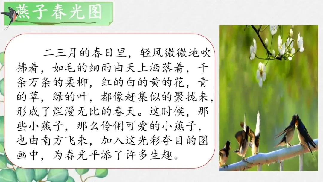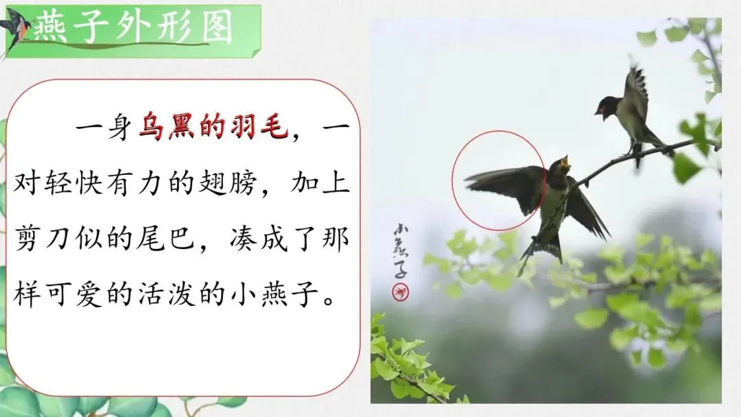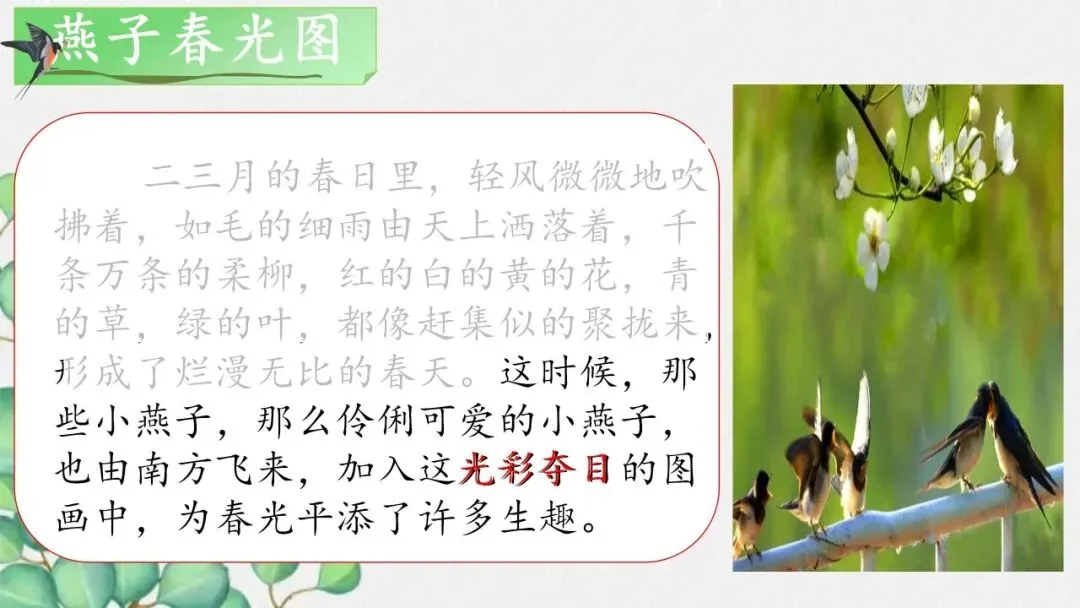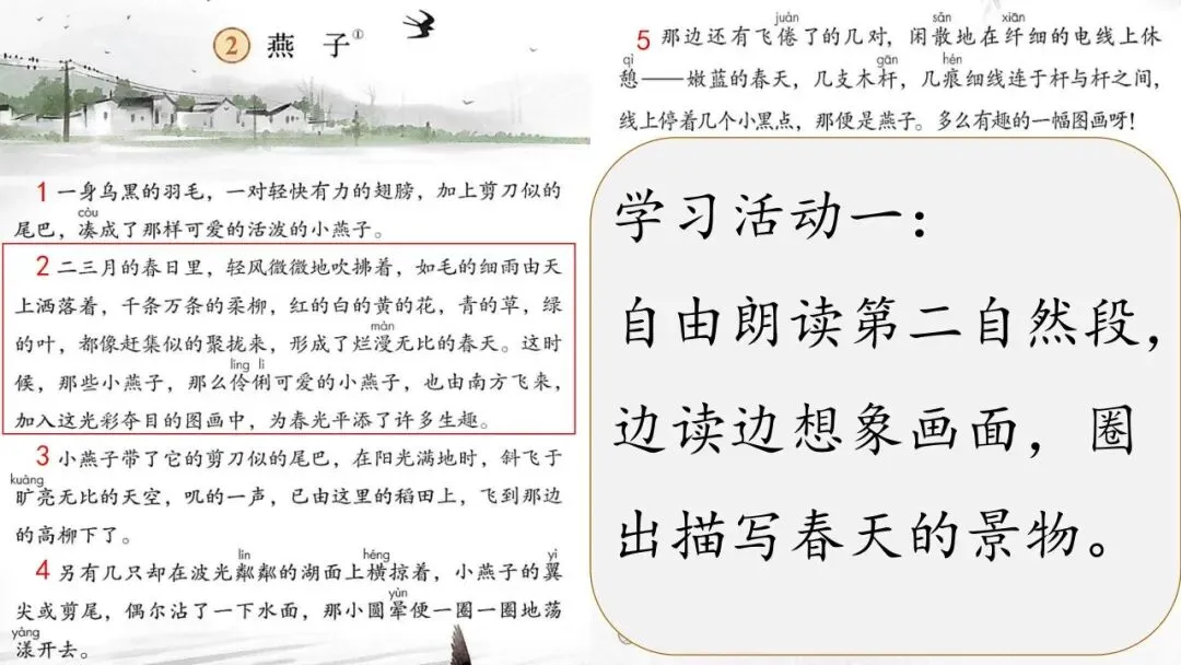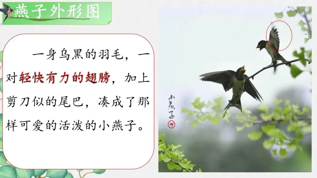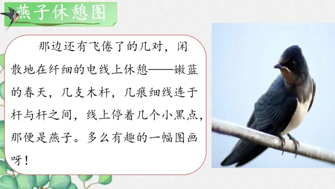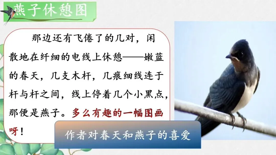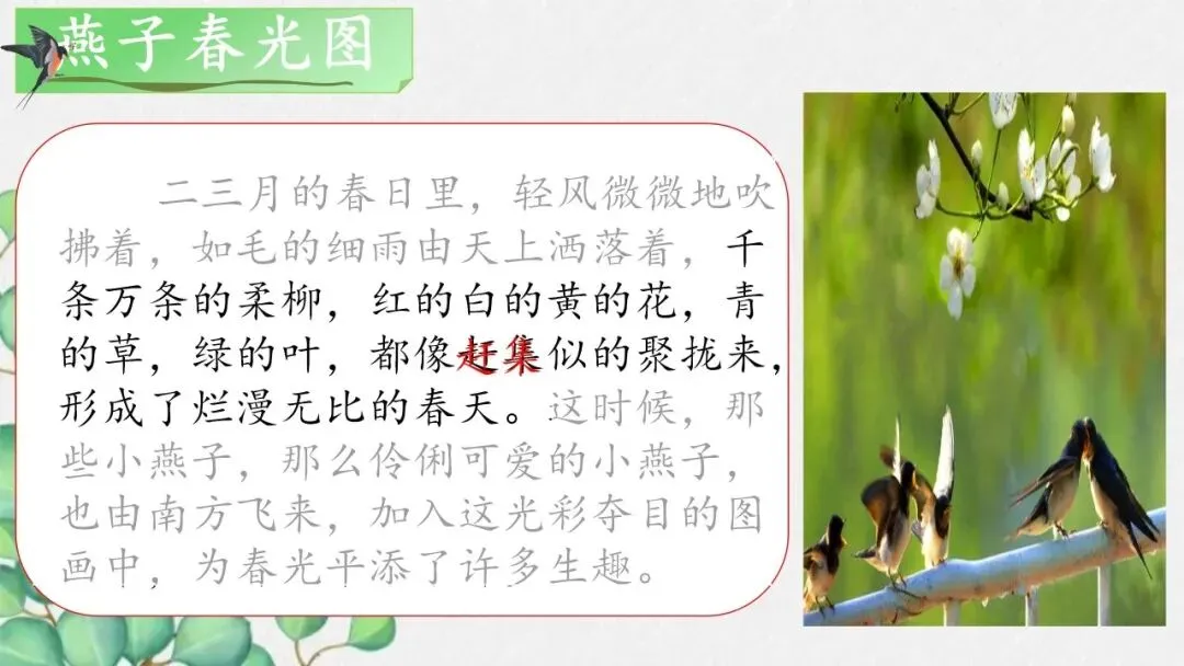 2.燕子教学目标:1.认识“凑、伶”等12个生字,读准多音字“散、杆”,会写“乌黑、活泼”等15个词语。 2.边读课文边想象画面,读出对燕子的喜爱之情。背诵第1~3自然段。 3.积累“剪刀似的尾巴”等词语,体会文中优美生动的语句并摘抄。 教学重难点:边读课文边想象画面,读出对燕子的喜爱之情。背诵第1~3自然段。 教学准备:ppt课件 教学课时:2课时 第一课时教学目标:1.认识“伶、俐”等12个生字,借助常用词语正确区别并读准多音字“散、杆”;会写“凑、泼、倦”等横画较多的字。正确读记“伶俐可爱、光彩夺目”等词语并延伸拓展类似的词语。 2.正确流利有感情地朗读课文。边读边想象画面,体会燕子的外形美和春天的光彩夺目。 3.通过反复有感情朗读、换词等方法,背诵第1、2自然段,积累优美生动的语句。 教学流程: 一、猜谜引人,揭示课题1.指名读谜面。 课件出示谜语:身穿黑眼袍,尾巴像剪刀,冬天去南方,春天又来到。 请同学们猜一猜,这是什么小动物?(出示:燕子) 2.你觉得这是一只怎样的燕子?学生交流。老师感受到大家都很喜欢小燕子,有一位著名作家郑振铎也特别喜欢燕子,写了这样一篇文章来赞美它!今天我们就来学习这篇课文吧。让我们来一起来读读课题。课件出示题目。 二、初读课文,整体感知1. 出示学习要求,请同学们自由读课文,并思考问题。 课件出示: 学习活动一: (1)读准字音,读通句子,难读的地方多读几遍。 (2)思考:作者是从哪几个方面来介绍燕子的? 2.检查字词 (1)出示认读词语。 课件出示: 横掠剪刀似的伶俐可爱闲散飞倦轻快有力 木杆几痕纤细旷亮无比波光粼粼 (2)检查生字的认读情况。 开火车读,去拼音读。 注意多音字“散”“ 杆 ”的读音: “散”在这里读“săn”,表示约束、松开或者零碎的意思;另外还有一个读音“sàn”,组词为“散会”,表示由聚集而分离或分散的意思。 “杆”在文中读“gān”,我们来读读文字的句子,表示长棍子的意思;还有一个读音是“găn”,我们来读读。在这里表示某些器物上细长的棍状部分。 (3)借助作业本,选择正确读音,指名读,读好难读的词语。 课件出示作业本第2题。 观察这两组词语,你有什么发现? 课件出示:发现第一行描写的燕子,第二行描写风景。 小结:烂漫无比的春天里有可爱活泼的小燕子。 3.梳理脉络 这篇课文的每个自然段都是一幅生动有趣的图画,读一读说一说,你看到了哪几幅画面,请同学们边读边想象,抓住关键词语简单概括,完成作业本第五题。 4.引导学生根据课文内容,给图画排序,梳理课文脉络。 (1)出示图片,启发思考。 课文通过文字描绘了一幅幅燕子图,老师也在网上找到相应的图片。你能根据文字找到相应的图片吗?出示四幅图请你看看每一幅图对应的是哪段文字。 (2)那你能根据图片,给图片起一个简单的题目。 燕子外形图 燕子飞行图 燕子休憩图 燕子春光图 学生交流,板书:外形图;春光图;飞行图 ;休憩图 (可让学生结合画面,给画面取名字) 总结:抓住文中的几个关键词,我们就能将课文内容与图片对应起来,找到相关的自然段。 三、边读边想象,感受燕子外形图1.引导:接下来我们就将镜头拉近,来欣赏这幅燕子外形图。 出示句子:一身乌黑的羽毛,一对轻快有力的翅膀,加上剪刀似的尾巴,凑成了那样可爱的活泼的小燕子。 2.请同学们抓住关键词,说一说哪些词语让自己眼前浮现出了一只可爱的活泼的小燕子。 预设1:“剪刀似的尾巴”这个词语用得很好,作者把燕子的尾巴比作剪刀,让我能一下子想到这是一只可爱的小燕子在天空中翱翔。 课件出示:剪刀似的尾巴。 预设2:读了“轻快有力的翅膀”这个词语,我眼前浮现出了一只活泼的小燕子,正扇动着翅膀,快乐地飞翔。 预设3:“乌黑的羽毛”写出了燕子的颜色,我仿佛看到了一只羽毛乌黑的燕子正飞来飞去呢! 3.比较阅读 如果老师把这些词语去掉,你觉得哪句话更好?说说理由。(品味生动的语言) 课件出示:比较阅读 4.总结:同学们不仅找准了描写燕子活泼可爱的关键词,而且通过边读边想象画面,感受到了燕子的活泼可爱。 5.作者是怎么将这些燕子的部位组合起来的?引出连接词:一身、一对、加上、凑成。 课件出示:一身、一对、加上、凑成 请小朋友们朗读第一自然段,读出对燕子的喜爱之情。 6.现在请你完成作业本第六题第1题,把第一自然段补充完整。有感情地朗读,读好“尾巴、燕子”的轻声。 7.借助短语,你能按照全身到局部的顺序,来试着背一背第1自然段。 课件出示: 乌黑的羽毛轻快有力的翅膀剪刀似的尾巴可爱的活泼的小燕子 四、拓展练笔。1.课文第一自然段描写了小燕子的外形,抓住了羽毛、翅膀、尾巴的特点来写,让人眼前一亮。请你从以下动物中选择其一,仿照这种写法写一写小动物的外形。 课件出示: (1)两只的耳朵,一双的眼睛,加上的尾巴,凑成了那样的小兔子。 (2)一对的眼睛,一条的尾巴,加上的鳞片,凑成了那样的小金鱼。 2.作者运用优美,生动的语言,将活泼可爱的燕子描绘得栩栩如生,具有很强的画面感,让我们再来读一读这段话吧。 课件出示:第一自然段。 3.像这样的短语还有很多,我们来读读。课件出示语文书课后第二题 五、指导书写1.指导书写:凑、泼、集、偶、尔 第2课时教学目标: 1.复习已学过的词语,正确书写“杆、纤、沾”等左右结构的字。 2.有感情朗读课文,积累优美
