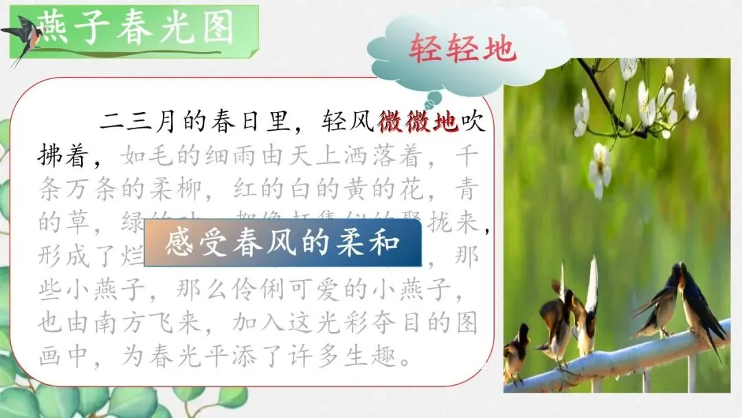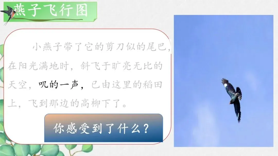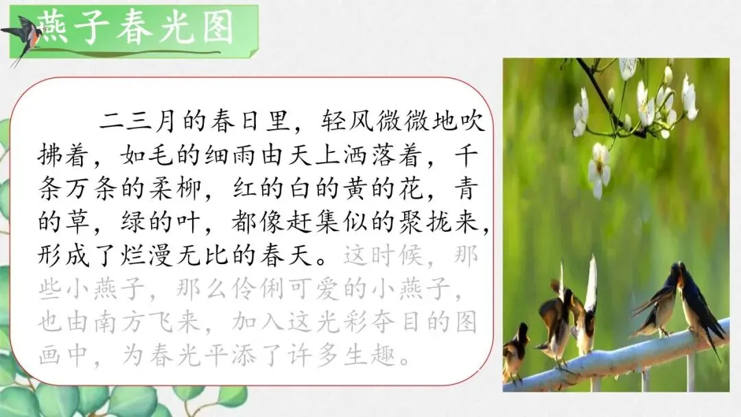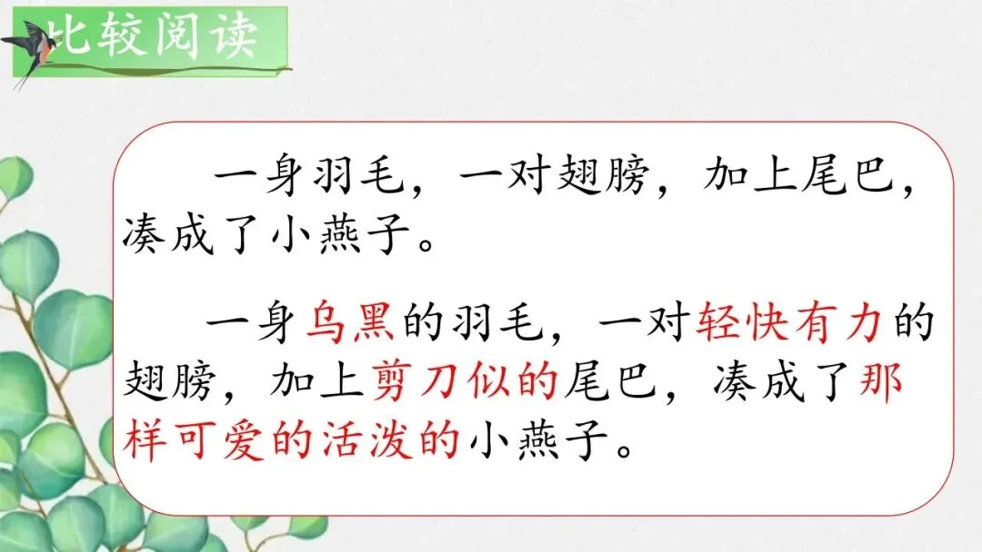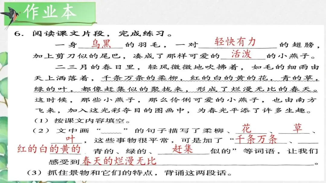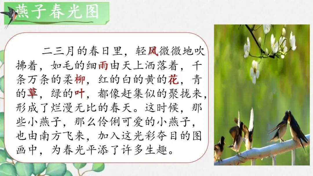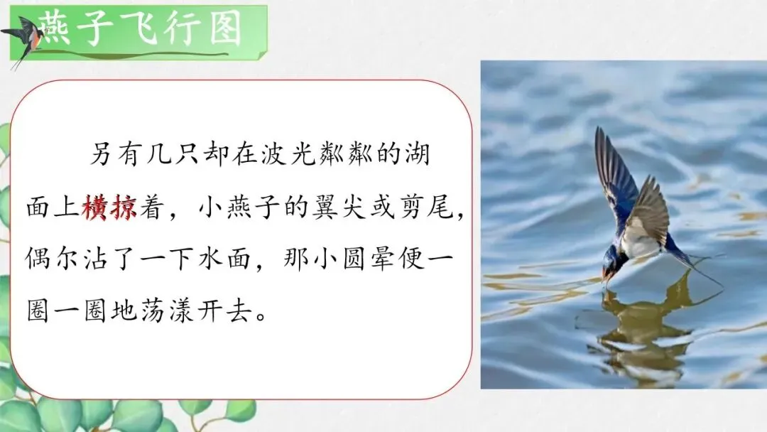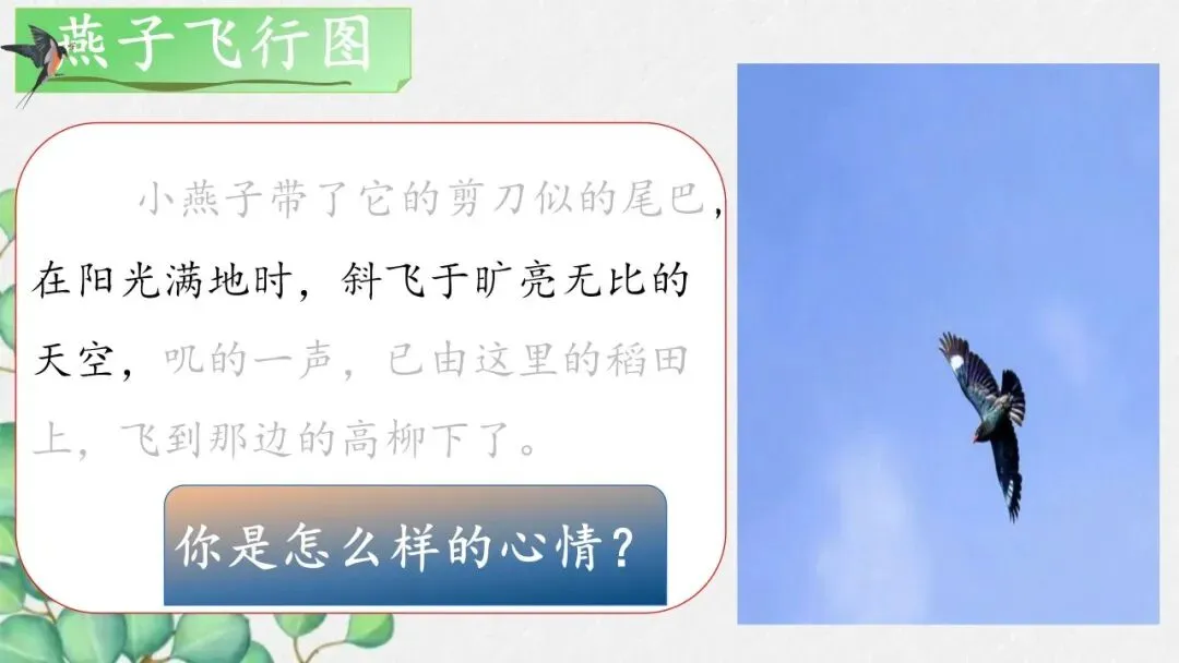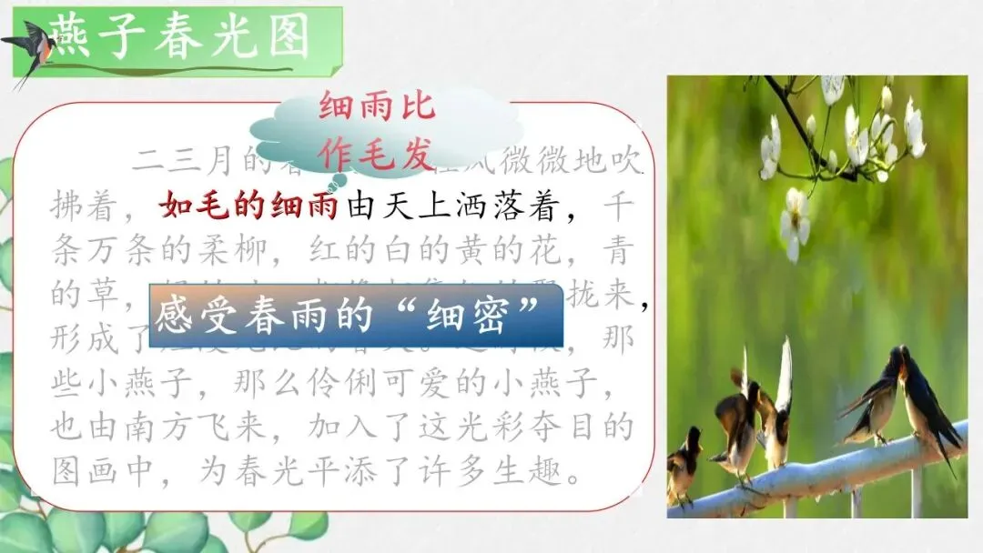 2.燕子教学目标:1.认识“凑、伶”等12个生字,读准多音字“散、杆”,会写“乌黑、活泼”等15个词语。 2.边读课文边想象画面,读出对燕子的喜爱之情。背诵第1~3自然段。 3.积累“剪刀似的尾巴”等词语,体会文中优美生动的语句并摘抄。 教学重难点:边读课文边想象画面,读出对燕子的喜爱之情。背诵第1~3自然段。 教学准备:ppt课件 教学课时:2课时 第一课时教学目标:1.认识“伶、俐”等12个生字,借助常用词语正确区别并读准多音字“散、杆”;会写“凑、泼、倦”等横画较多的字。正确读记“伶俐可爱、光彩夺目”等词语并延伸拓展类似的词语。 2.正确流利有感情地朗读课文。边读边想象画面,体会燕子的外形美和春天的光彩夺目。 3.通过反复有感情朗读、换词等方法,背诵第1、2自然段,积累优美生动的语句。 教学流程: 一、猜谜引人,揭示课题1.指名读谜面。 课件出示谜语:身穿黑眼袍,尾巴像剪刀,冬天去南方,春天又来到。 请同学们猜一猜,这是什么小动物?(出示:燕子) 2.你觉得这是一只怎样的燕子?学生交流。老师感受到大家都很喜欢小燕子,有一位著名作家郑振铎也特别喜欢燕子,写了这样一篇文章来赞美它!今天我们就来学习这篇课文吧。让我们来一起来读读课题。课件出示题目。 二、初读课文,整体感知1. 出示学习要求,请同学们自由读课文,并思考问题。 课件出示: 学习活动一: (1)读准字音,读通句子,难读的地方多读几遍。 (2)思考:作者是从哪几个方面来介绍燕子的? 2.检查字词 (1)出示认读词语。 课件出示: 横掠剪刀似的伶俐可爱闲散飞倦轻快有力 木杆几痕纤细旷亮无比波光粼粼 (2)检查生字的认读情况。 开火车读,去拼音读。 注意多音字“散”“ 杆 ”的读音: “散”在这里读“săn”,表示约束、松开或者零碎的意思;另外还有一个读音“sàn”,组词为“散会”,表示由聚集而分离或分散的意思。 “杆”在文中读“gān”,我们来读读文字的句子,表示长棍子的意思;还有一个读音是“găn”,我们来读读。在这里表示某些器物上细长的棍状部分。 (3)借助作业本,选择正确读音,指名读,读好难读的词语。 课件出示作业本第2题。 观察这两组词语,你有什么发现? 课件出示:发现第一行描写的燕子,第二行描写风景。 小结:烂漫无比的春天里有可爱活泼的小燕子。 3.梳理脉络 这篇课文的每个自然段都是一幅生动有趣的图画,读一读说一说,你看到了哪几幅画面,请同学们边读边想象,抓住关键词语简单概括,完成作业本第五题。 4.引导学生根据课文内容,给图画排序,梳理课文脉络。 (1)出示图片,启发思考。 课文通过文字描绘了一幅幅燕子图,老师也在网上找到相应的图片。你能根据文字找到相应的图片吗?出示四幅图请你看看每一幅图对应的是哪段文字。 (2)那你能根据图片,给图片起一个简单的题目。 燕子外形图 燕子飞行图 燕子休憩图 燕子春光图 学生交流,板书:外形图;春光图;飞行图 ;休憩图 (可让学生结合画面,给画面取名字) 总结:抓住文中的几个关键词,我们就能将课文内容与图片对应起来,找到相关的自然段。 三、边读边想象,感受燕子外形图1.引导:接下来我们就将镜头拉近,来欣赏这幅燕子外形图。 出示句子:一身乌黑的羽毛,一对轻快有力的翅膀,加上剪刀似的尾巴,凑成了那样可爱的活泼的小燕子。 2.请同学们抓住关键词,说一说哪些词语让自己眼前浮现出了一只可爱的活泼的小燕子。 预设1:“剪刀似的尾巴”这个词语用得很好,作者把燕子的尾巴比作剪刀,让我能一下子想到这是一只可爱的小燕子在天空中翱翔。 课件出示:剪刀似的尾巴。 预设2:读了“轻快有力的翅膀”这个词语,我眼前浮现出了一只活泼的小燕子,正扇动着翅膀,快乐地飞翔。 预设3:“乌黑的羽毛”写出了燕子的颜色,我仿佛看到了一只羽毛乌黑的燕子正飞来飞去呢! 3.比较阅读 如果老师把这些词语去掉,你觉得哪句话更好?说说理由。(品味生动的语言) 课件出示:比较阅读 4.总结:同学们不仅找准了描写燕子活泼可爱的关键词,而且通过边读边想象画面,感受到了燕子的活泼可爱。 5.作者是怎么将这些燕子的部位组合起来的?引出连接词:一身、一对、加上、凑成。 课件出示:一身、一对、加上、凑成 请小朋友们朗读第一自然段,读出对燕子的喜爱之情。 6.现在请你完成作业本第六题第1题,把第一自然段补充完整。有感情地朗读,读好“尾巴、燕子”的轻声。 7.借助短语,你能按照全身到局部的顺序,来试着背一背第1自然段。 课件出示: 乌黑的羽毛轻快有力的翅膀剪刀似的尾巴可爱的活泼的小燕子 四、拓展练笔。1.课文第一自然段描写了小燕子的外形,抓住了羽毛、翅膀、尾巴的特点来写,让人眼前一亮。请你从以下动物中选择其一,仿照这种写法写一写小动物的外形。 课件出示: (1)两只的耳朵,一双的眼睛,加上的尾巴,凑成了那样的小兔子。 (2)一对的眼睛,一条的尾巴,加上的鳞片,凑成了那样的小金鱼。 2.作者运用优美,生动的语言,将活泼可爱的燕子描绘得栩栩如生,具有很强的画面感,让我们再来读一读这段话吧。 课件出示:第一自然段。 3.像这样的短语还有很多,我们来读读。课件出示语文书课后第二题 五、指导书写1.指导书写:凑、泼、集、偶、尔 第2课时教学目标: 1.复习已学过的词语,正确书写“杆、纤、沾”等左右结构的字。 2.有感情朗读课文,积累优美