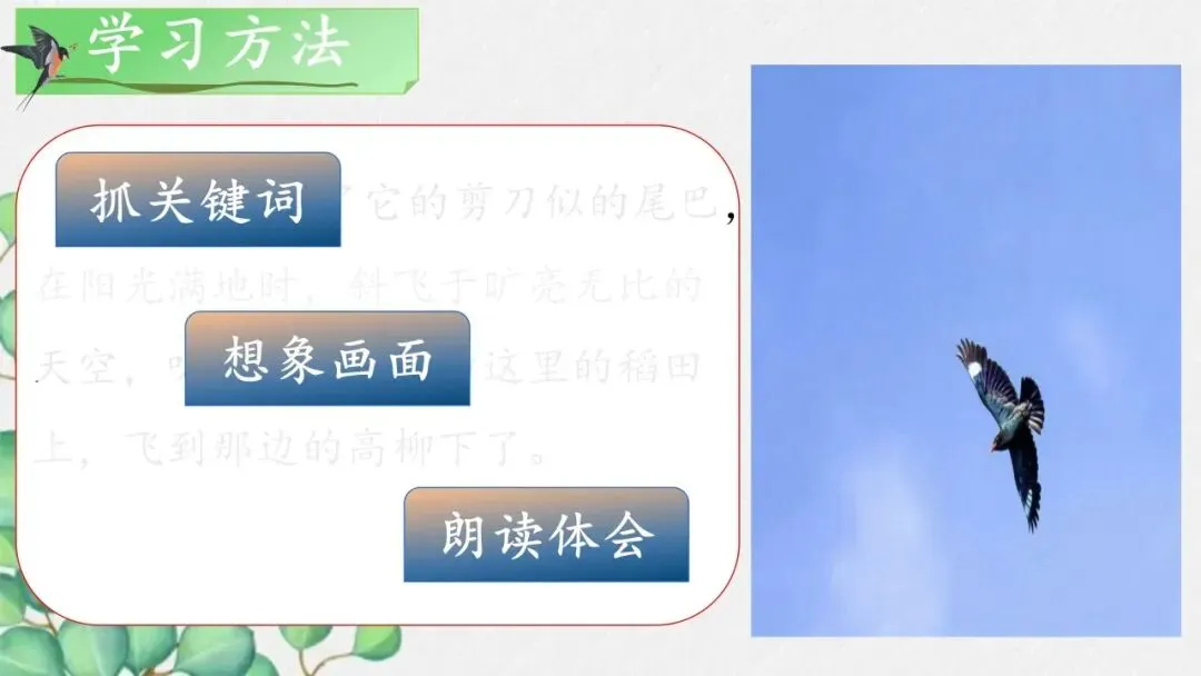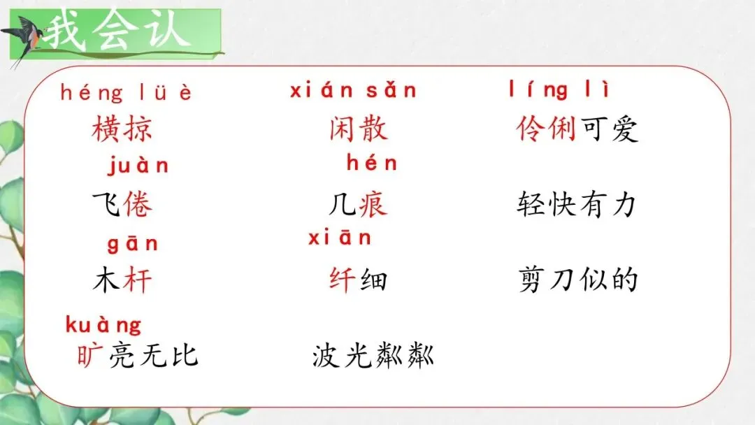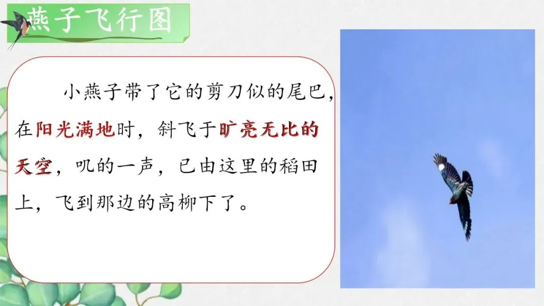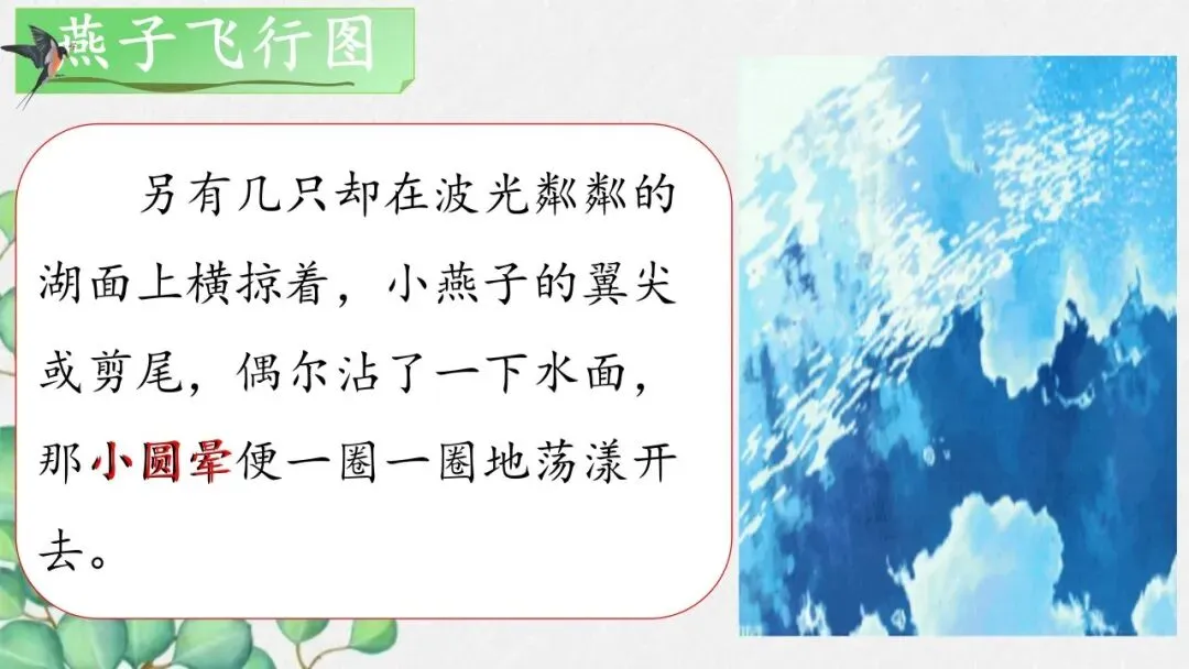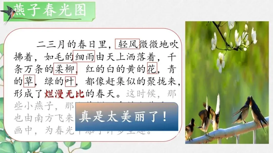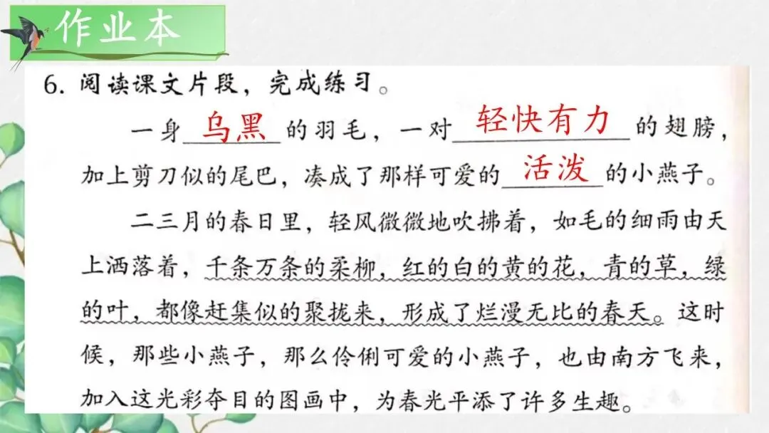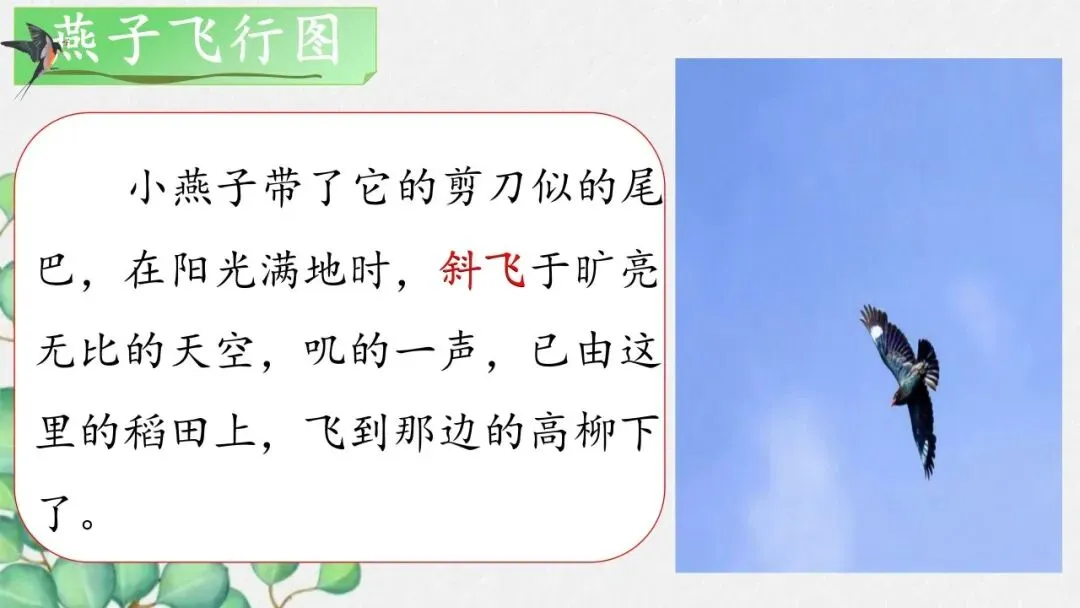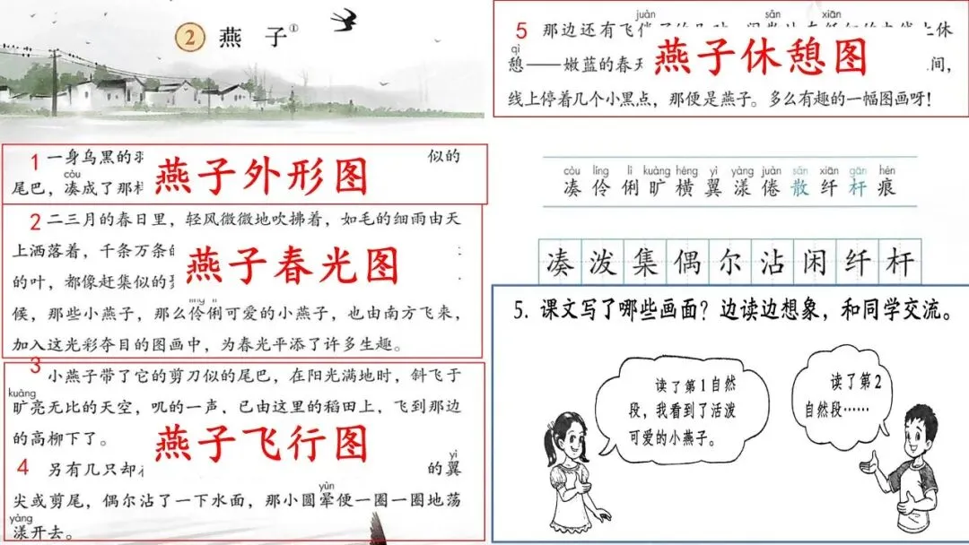 2.燕子教学目标:1.认识“凑、伶”等12个生字,读准多音字“散、杆”,会写“乌黑、活泼”等15个词语。 2.边读课文边想象画面,读出对燕子的喜爱之情。背诵第1~3自然段。 3.积累“剪刀似的尾巴”等词语,体会文中优美生动的语句并摘抄。 教学重难点:边读课文边想象画面,读出对燕子的喜爱之情。背诵第1~3自然段。 教学准备:ppt课件 教学课时:2课时 第一课时教学目标:1.认识“伶、俐”等12个生字,借助常用词语正确区别并读准多音字“散、杆”;会写“凑、泼、倦”等横画较多的字。正确读记“伶俐可爱、光彩夺目”等词语并延伸拓展类似的词语。 2.正确流利有感情地朗读课文。边读边想象画面,体会燕子的外形美和春天的光彩夺目。 3.通过反复有感情朗读、换词等方法,背诵第1、2自然段,积累优美生动的语句。 教学流程: 一、猜谜引人,揭示课题1.指名读谜面。 课件出示谜语:身穿黑眼袍,尾巴像剪刀,冬天去南方,春天又来到。 请同学们猜一猜,这是什么小动物?(出示:燕子) 2.你觉得这是一只怎样的燕子?学生交流。老师感受到大家都很喜欢小燕子,有一位著名作家郑振铎也特别喜欢燕子,写了这样一篇文章来赞美它!今天我们就来学习这篇课文吧。让我们来一起来读读课题。课件出示题目。 二、初读课文,整体感知1. 出示学习要求,请同学们自由读课文,并思考问题。 课件出示: 学习活动一: (1)读准字音,读通句子,难读的地方多读几遍。 (2)思考:作者是从哪几个方面来介绍燕子的? 2.检查字词 (1)出示认读词语。 课件出示: 横掠剪刀似的伶俐可爱闲散飞倦轻快有力 木杆几痕纤细旷亮无比波光粼粼 (2)检查生字的认读情况。 开火车读,去拼音读。 注意多音字“散”“ 杆 ”的读音: “散”在这里读“săn”,表示约束、松开或者零碎的意思;另外还有一个读音“sàn”,组词为“散会”,表示由聚集而分离或分散的意思。 “杆”在文中读“gān”,我们来读读文字的句子,表示长棍子的意思;还有一个读音是“găn”,我们来读读。在这里表示某些器物上细长的棍状部分。 (3)借助作业本,选择正确读音,指名读,读好难读的词语。 课件出示作业本第2题。 观察这两组词语,你有什么发现? 课件出示:发现第一行描写的燕子,第二行描写风景。 小结:烂漫无比的春天里有可爱活泼的小燕子。 3.梳理脉络 这篇课文的每个自然段都是一幅生动有趣的图画,读一读说一说,你看到了哪几幅画面,请同学们边读边想象,抓住关键词语简单概括,完成作业本第五题。 4.引导学生根据课文内容,给图画排序,梳理课文脉络。 (1)出示图片,启发思考。 课文通过文字描绘了一幅幅燕子图,老师也在网上找到相应的图片。你能根据文字找到相应的图片吗?出示四幅图请你看看每一幅图对应的是哪段文字。 (2)那你能根据图片,给图片起一个简单的题目。 燕子外形图 燕子飞行图 燕子休憩图 燕子春光图 学生交流,板书:外形图;春光图;飞行图 ;休憩图 (可让学生结合画面,给画面取名字) 总结:抓住文中的几个关键词,我们就能将课文内容与图片对应起来,找到相关的自然段。 三、边读边想象,感受燕子外形图1.引导:接下来我们就将镜头拉近,来欣赏这幅燕子外形图。 出示句子:一身乌黑的羽毛,一对轻快有力的翅膀,加上剪刀似的尾巴,凑成了那样可爱的活泼的小燕子。 2.请同学们抓住关键词,说一说哪些词语让自己眼前浮现出了一只可爱的活泼的小燕子。 预设1:“剪刀似的尾巴”这个词语用得很好,作者把燕子的尾巴比作剪刀,让我能一下子想到这是一只可爱的小燕子在天空中翱翔。 课件出示:剪刀似的尾巴。 预设2:读了“轻快有力的翅膀”这个词语,我眼前浮现出了一只活泼的小燕子,正扇动着翅膀,快乐地飞翔。 预设3:“乌黑的羽毛”写出了燕子的颜色,我仿佛看到了一只羽毛乌黑的燕子正飞来飞去呢! 3.比较阅读 如果老师把这些词语去掉,你觉得哪句话更好?说说理由。(品味生动的语言) 课件出示:比较阅读 4.总结:同学们不仅找准了描写燕子活泼可爱的关键词,而且通过边读边想象画面,感受到了燕子的活泼可爱。 5.作者是怎么将这些燕子的部位组合起来的?引出连接词:一身、一对、加上、凑成。 课件出示:一身、一对、加上、凑成 请小朋友们朗读第一自然段,读出对燕子的喜爱之情。 6.现在请你完成作业本第六题第1题,把第一自然段补充完整。有感情地朗读,读好“尾巴、燕子”的轻声。 7.借助短语,你能按照全身到局部的顺序,来试着背一背第1自然段。 课件出示: 乌黑的羽毛轻快有力的翅膀剪刀似的尾巴可爱的活泼的小燕子 四、拓展练笔。1.课文第一自然段描写了小燕子的外形,抓住了羽毛、翅膀、尾巴的特点来写,让人眼前一亮。请你从以下动物中选择其一,仿照这种写法写一写小动物的外形。 课件出示: (1)两只的耳朵,一双的眼睛,加上的尾巴,凑成了那样的小兔子。 (2)一对的眼睛,一条的尾巴,加上的鳞片,凑成了那样的小金鱼。 2.作者运用优美,生动的语言,将活泼可爱的燕子描绘得栩栩如生,具有很强的画面感,让我们再来读一读这段话吧。 课件出示:第一自然段。 3.像这样的短语还有很多,我们来读读。课件出示语文书课后第二题 五、指导书写1.指导书写:凑、泼、集、偶、尔 第2课时教学目标: 1.复习已学过的词语,正确书写“杆、纤、沾”等左右结构的字。 2.有感情朗读课文,积累优美