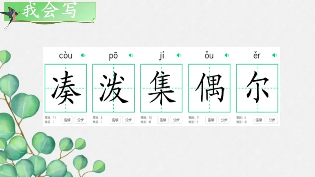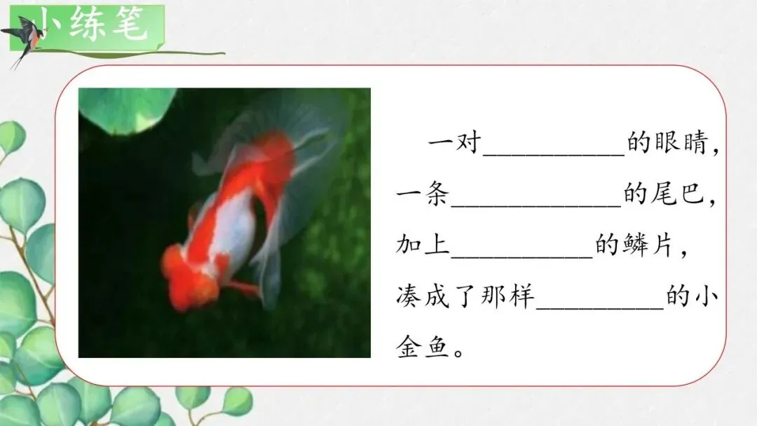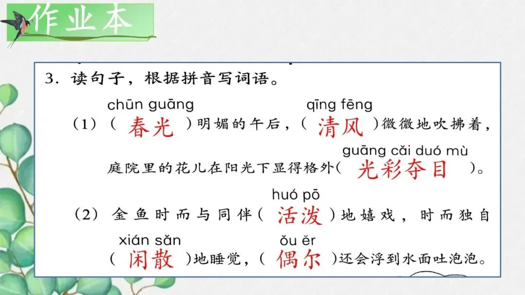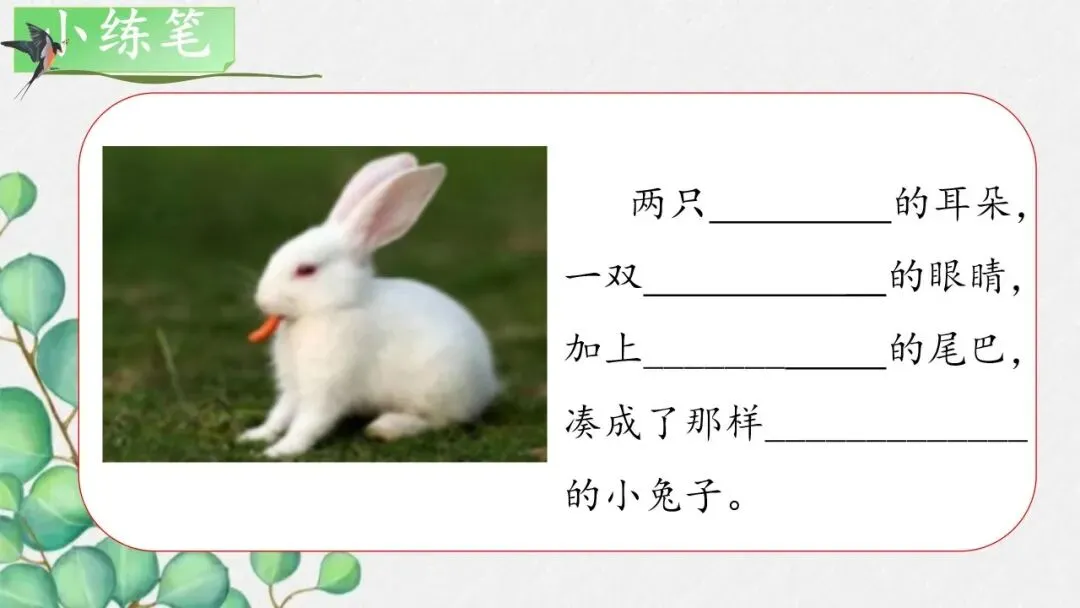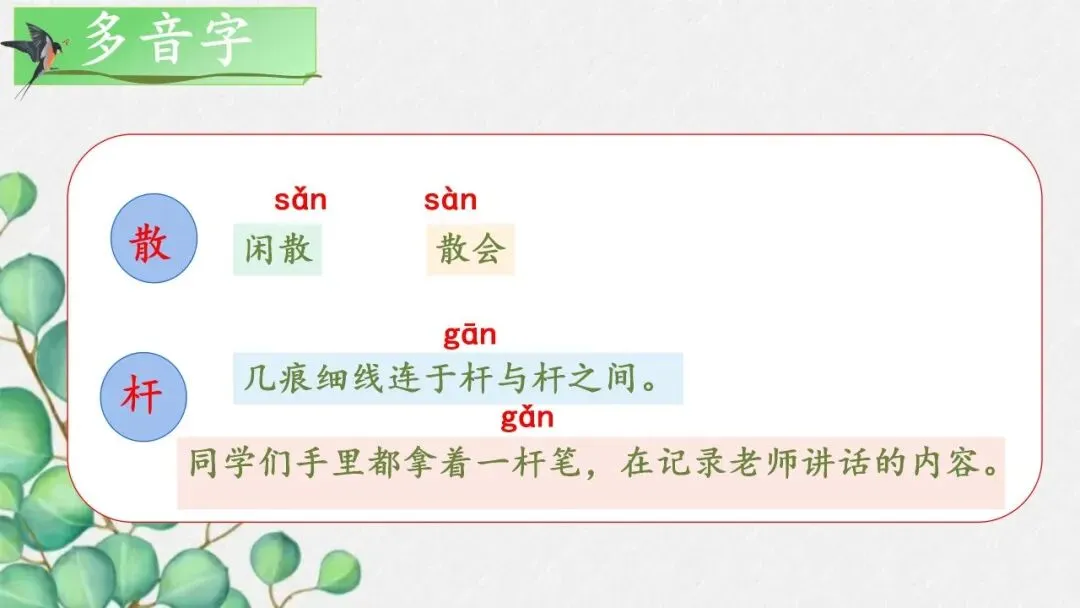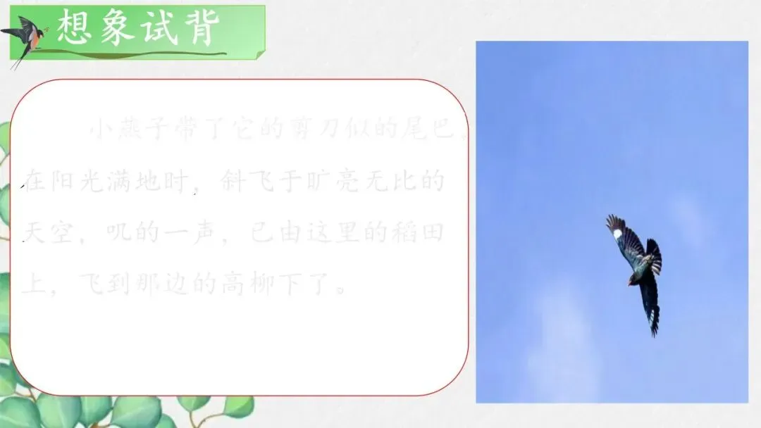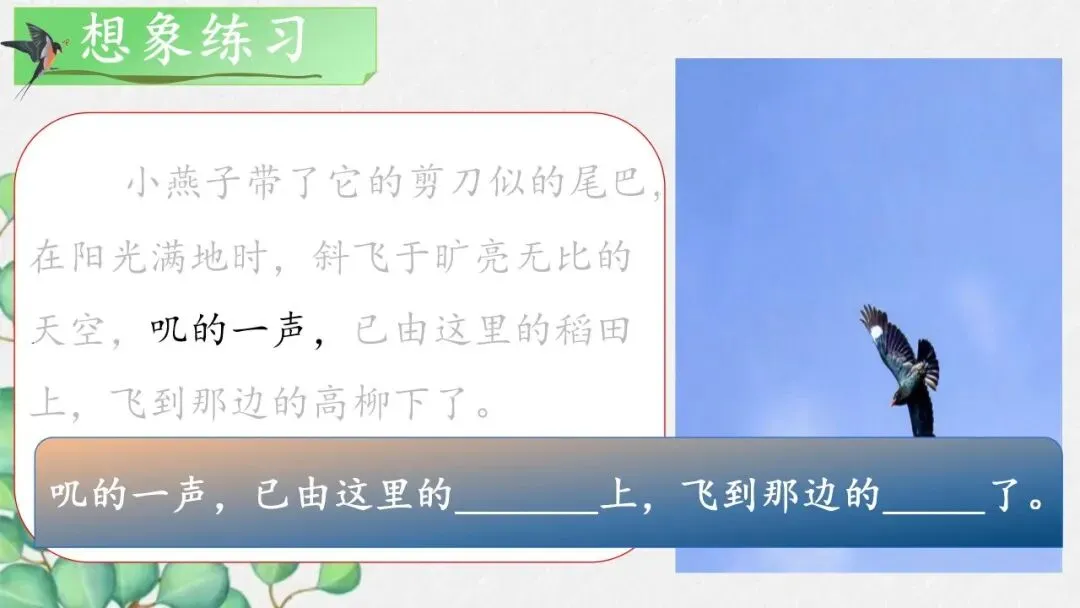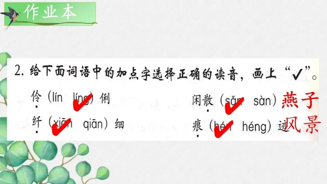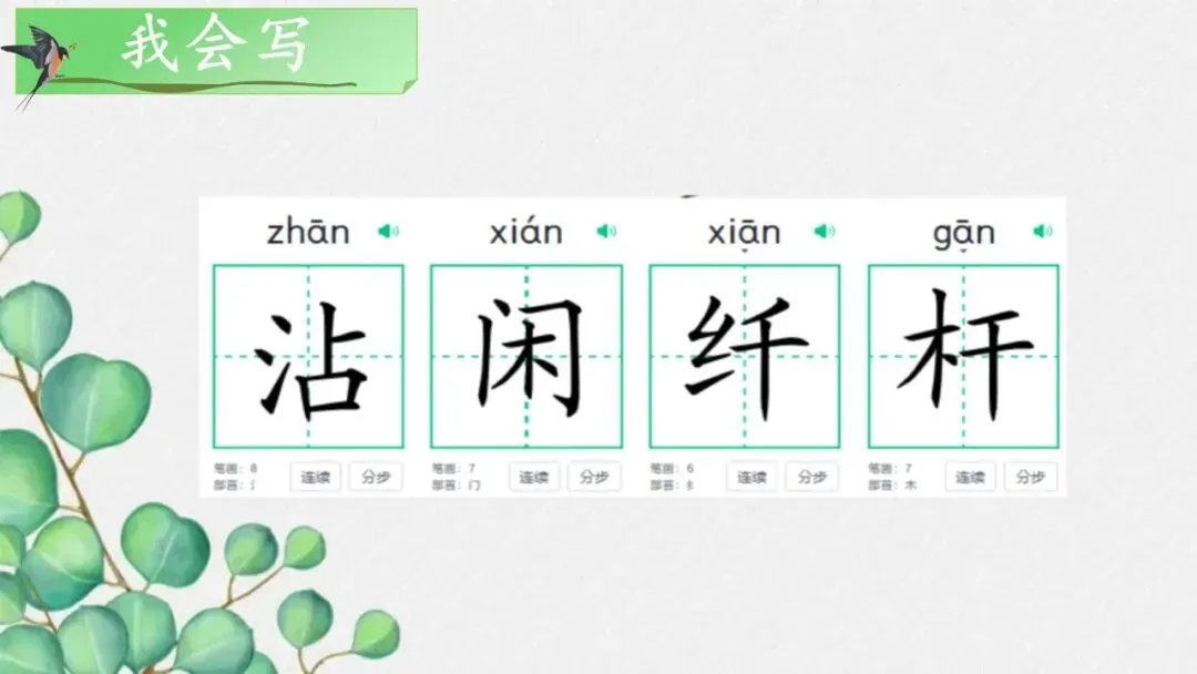 2.燕子教学目标:1.认识“凑、伶”等12个生字,读准多音字“散、杆”,会写“乌黑、活泼”等15个词语。 2.边读课文边想象画面,读出对燕子的喜爱之情。背诵第1~3自然段。 3.积累“剪刀似的尾巴”等词语,体会文中优美生动的语句并摘抄。 教学重难点:边读课文边想象画面,读出对燕子的喜爱之情。背诵第1~3自然段。 教学准备:ppt课件 教学课时:2课时 第一课时教学目标:1.认识“伶、俐”等12个生字,借助常用词语正确区别并读准多音字“散、杆”;会写“凑、泼、倦”等横画较多的字。正确读记“伶俐可爱、光彩夺目”等词语并延伸拓展类似的词语。 2.正确流利有感情地朗读课文。边读边想象画面,体会燕子的外形美和春天的光彩夺目。 3.通过反复有感情朗读、换词等方法,背诵第1、2自然段,积累优美生动的语句。 教学流程: 一、猜谜引人,揭示课题1.指名读谜面。 课件出示谜语:身穿黑眼袍,尾巴像剪刀,冬天去南方,春天又来到。 请同学们猜一猜,这是什么小动物?(出示:燕子) 2.你觉得这是一只怎样的燕子?学生交流。老师感受到大家都很喜欢小燕子,有一位著名作家郑振铎也特别喜欢燕子,写了这样一篇文章来赞美它!今天我们就来学习这篇课文吧。让我们来一起来读读课题。课件出示题目。 二、初读课文,整体感知1. 出示学习要求,请同学们自由读课文,并思考问题。 课件出示: 学习活动一: (1)读准字音,读通句子,难读的地方多读几遍。 (2)思考:作者是从哪几个方面来介绍燕子的? 2.检查字词 (1)出示认读词语。 课件出示: 横掠剪刀似的伶俐可爱闲散飞倦轻快有力 木杆几痕纤细旷亮无比波光粼粼 (2)检查生字的认读情况。 开火车读,去拼音读。 注意多音字“散”“ 杆 ”的读音: “散”在这里读“săn”,表示约束、松开或者零碎的意思;另外还有一个读音“sàn”,组词为“散会”,表示由聚集而分离或分散的意思。 “杆”在文中读“gān”,我们来读读文字的句子,表示长棍子的意思;还有一个读音是“găn”,我们来读读。在这里表示某些器物上细长的棍状部分。 (3)借助作业本,选择正确读音,指名读,读好难读的词语。 课件出示作业本第2题。 观察这两组词语,你有什么发现? 课件出示:发现第一行描写的燕子,第二行描写风景。 小结:烂漫无比的春天里有可爱活泼的小燕子。 3.梳理脉络 这篇课文的每个自然段都是一幅生动有趣的图画,读一读说一说,你看到了哪几幅画面,请同学们边读边想象,抓住关键词语简单概括,完成作业本第五题。 4.引导学生根据课文内容,给图画排序,梳理课文脉络。 (1)出示图片,启发思考。 课文通过文字描绘了一幅幅燕子图,老师也在网上找到相应的图片。你能根据文字找到相应的图片吗?出示四幅图请你看看每一幅图对应的是哪段文字。 (2)那你能根据图片,给图片起一个简单的题目。 燕子外形图 燕子飞行图 燕子休憩图 燕子春光图 学生交流,板书:外形图;春光图;飞行图 ;休憩图 (可让学生结合画面,给画面取名字) 总结:抓住文中的几个关键词,我们就能将课文内容与图片对应起来,找到相关的自然段。 三、边读边想象,感受燕子外形图1.引导:接下来我们就将镜头拉近,来欣赏这幅燕子外形图。 出示句子:一身乌黑的羽毛,一对轻快有力的翅膀,加上剪刀似的尾巴,凑成了那样可爱的活泼的小燕子。 2.请同学们抓住关键词,说一说哪些词语让自己眼前浮现出了一只可爱的活泼的小燕子。 预设1:“剪刀似的尾巴”这个词语用得很好,作者把燕子的尾巴比作剪刀,让我能一下子想到这是一只可爱的小燕子在天空中翱翔。 课件出示:剪刀似的尾巴。 预设2:读了“轻快有力的翅膀”这个词语,我眼前浮现出了一只活泼的小燕子,正扇动着翅膀,快乐地飞翔。 预设3:“乌黑的羽毛”写出了燕子的颜色,我仿佛看到了一只羽毛乌黑的燕子正飞来飞去呢! 3.比较阅读 如果老师把这些词语去掉,你觉得哪句话更好?说说理由。(品味生动的语言) 课件出示:比较阅读 4.总结:同学们不仅找准了描写燕子活泼可爱的关键词,而且通过边读边想象画面,感受到了燕子的活泼可爱。 5.作者是怎么将这些燕子的部位组合起来的?引出连接词:一身、一对、加上、凑成。 课件出示:一身、一对、加上、凑成 请小朋友们朗读第一自然段,读出对燕子的喜爱之情。 6.现在请你完成作业本第六题第1题,把第一自然段补充完整。有感情地朗读,读好“尾巴、燕子”的轻声。 7.借助短语,你能按照全身到局部的顺序,来试着背一背第1自然段。 课件出示: 乌黑的羽毛轻快有力的翅膀剪刀似的尾巴可爱的活泼的小燕子 四、拓展练笔。1.课文第一自然段描写了小燕子的外形,抓住了羽毛、翅膀、尾巴的特点来写,让人眼前一亮。请你从以下动物中选择其一,仿照这种写法写一写小动物的外形。 课件出示: (1)两只的耳朵,一双的眼睛,加上的尾巴,凑成了那样的小兔子。 (2)一对的眼睛,一条的尾巴,加上的鳞片,凑成了那样的小金鱼。 2.作者运用优美,生动的语言,将活泼可爱的燕子描绘得栩栩如生,具有很强的画面感,让我们再来读一读这段话吧。 课件出示:第一自然段。 3.像这样的短语还有很多,我们来读读。课件出示语文书课后第二题 五、指导书写1.指导书写:凑、泼、集、偶、尔 第2课时教学目标: 1.复习已学过的词语,正确书写“杆、纤、沾”等左右结构的字。 2.有感情朗读课文,积累优美