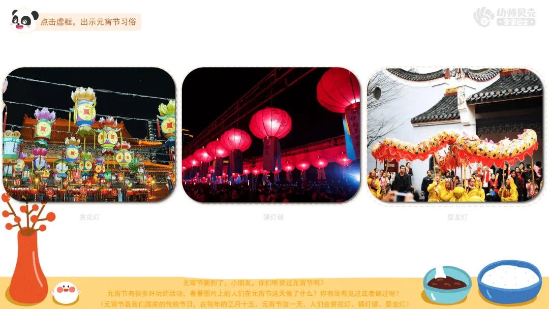 看图片,了解元宵节的时间与习俗,知道元宵节吃汤圆的寓意。