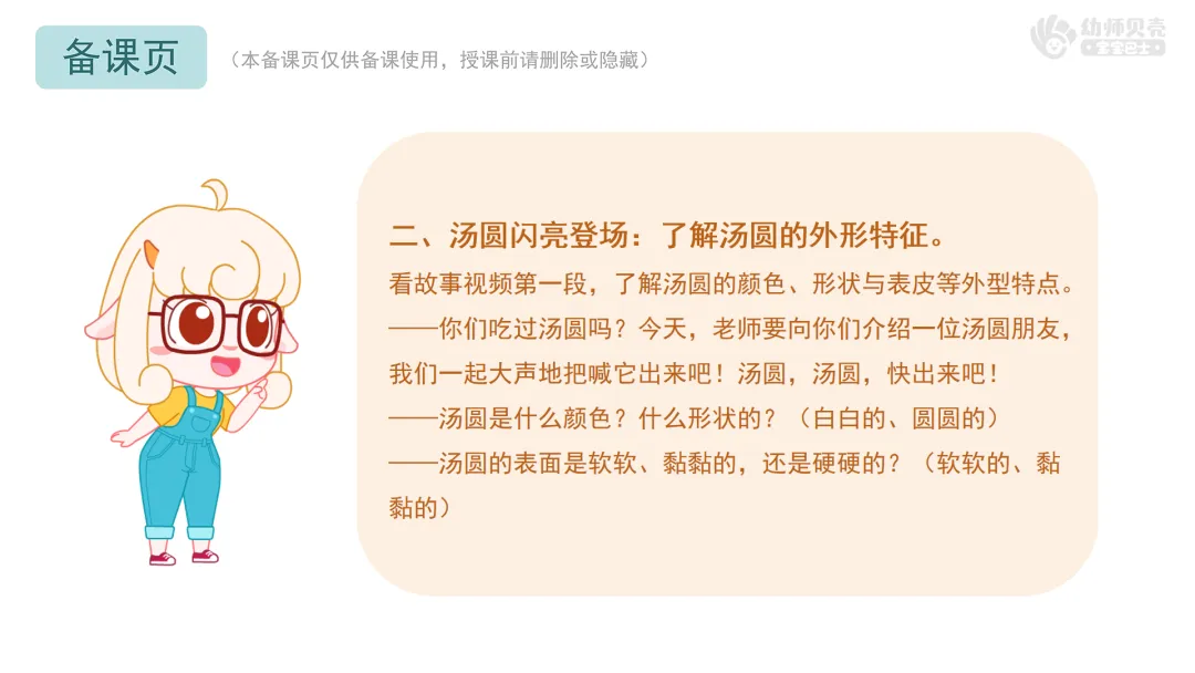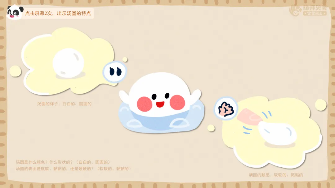 看故事视频第一段,了解汤圆的颜色、形状与表皮等外型特点。