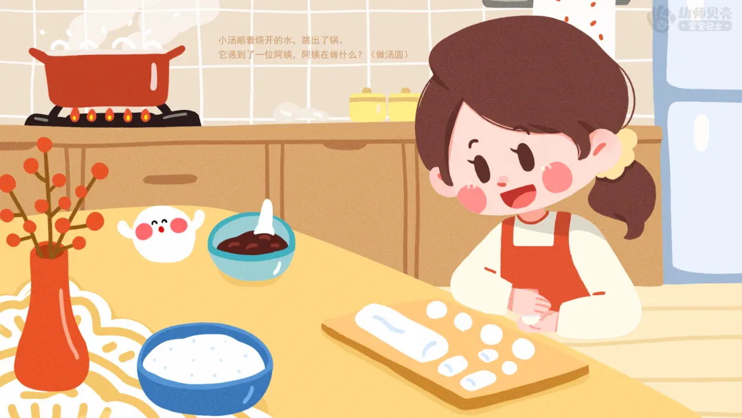 ——小汤顺着烧开的水,跳出了锅。它遇到了一位阿姨,阿姨在做什么?(做汤圆)