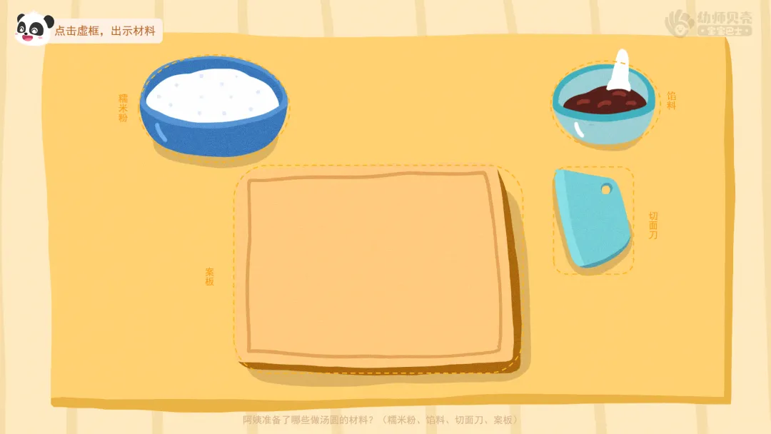 ——她准备了哪些做汤圆的材料?(糯米粉、馅料、切面刀、案板)