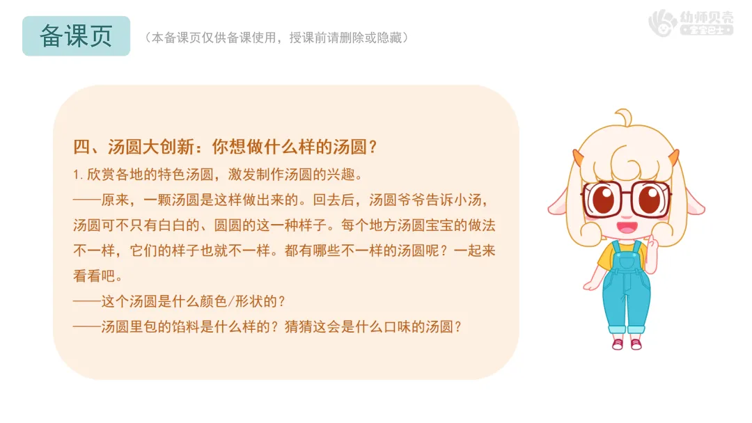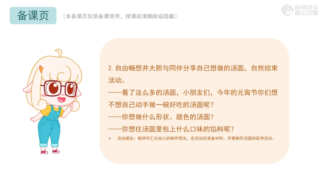 Ø活动建议:教师可汇总幼儿的制作想法,在活动后准备材料,开展制作汤圆的延伸活动。