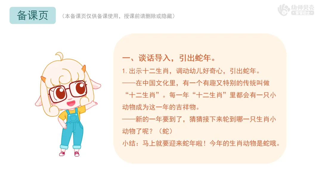春节,作为中国最重要的传统节日之一,不仅蕴含着丰富的文化内涵,更是传承和弘扬中国传统文化的重要契机。对于小班幼儿而言,处于认知发展的初期阶段,对事物的认知主要依赖于具体的形象。通过具体、生动、有趣的方式能够引导他们接触和了解传统文化,并激发他们对中国文化的兴趣和热爱。而十二生肖,作为中国传统文化中的瑰宝,以其独特的动物形象和深厚的寓意,更是成为了春节中不可或缺的文化符号。因此,在蛇年到来之际,本活动通过可爱的小蛇形象,带领幼儿展开一场奇幻的寻“蛇”之旅,并串联起一系列春节的传统习俗,如购买年货、贴春联、吃年夜饭等等,使幼儿在生动有趣的故事和画面中,自然而然地接触到这些习俗,感受浓厚的节日氛围。在参与中了解新年的传统习俗,增强民族自豪感和归属感。