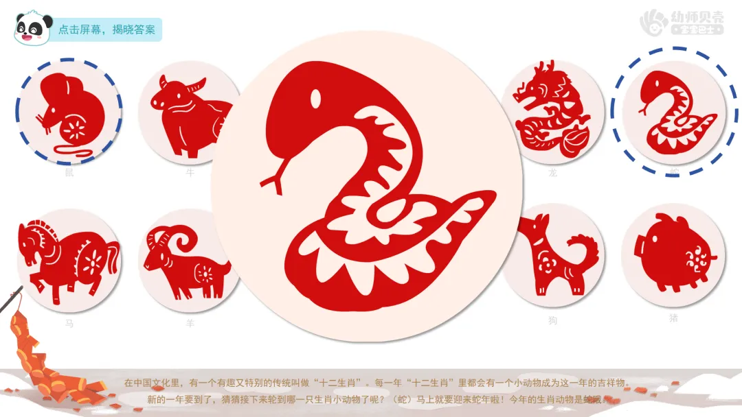 ——在中国文化里,有一个有趣又特别的传统叫做“十二生肖”。每一年“十二生肖”里都会有一只小动物成为这一年的吉祥物。——新的一年要到了,猜猜接下来轮到哪一只生肖小动物了呢?(蛇)