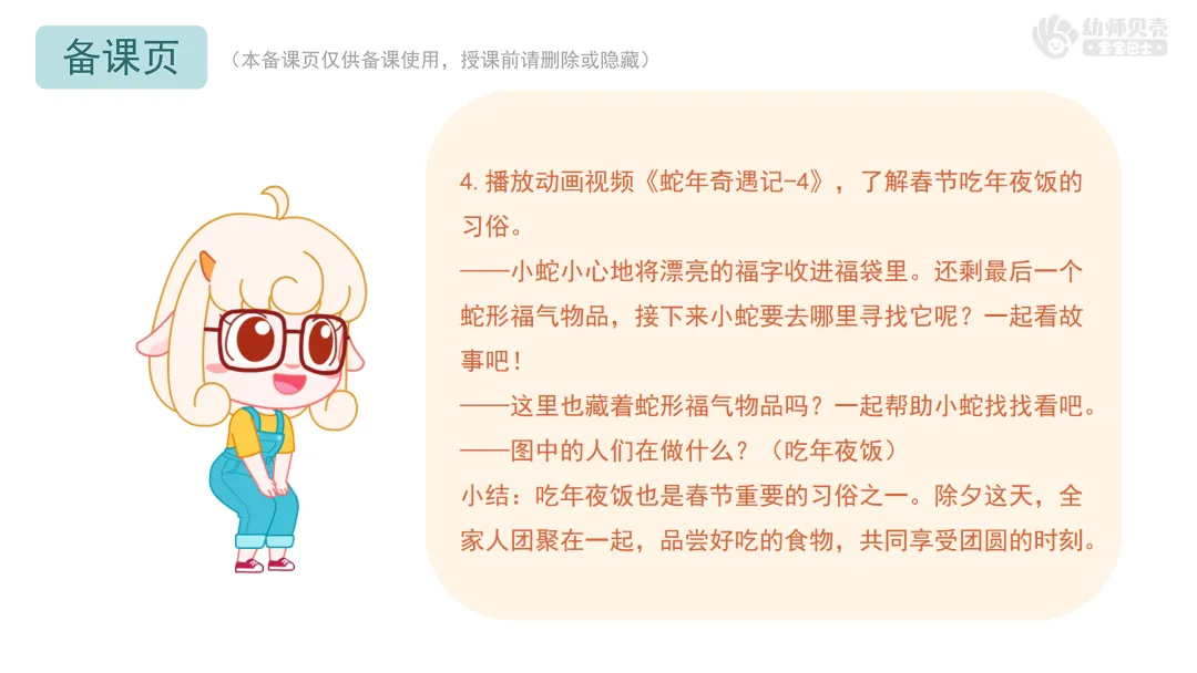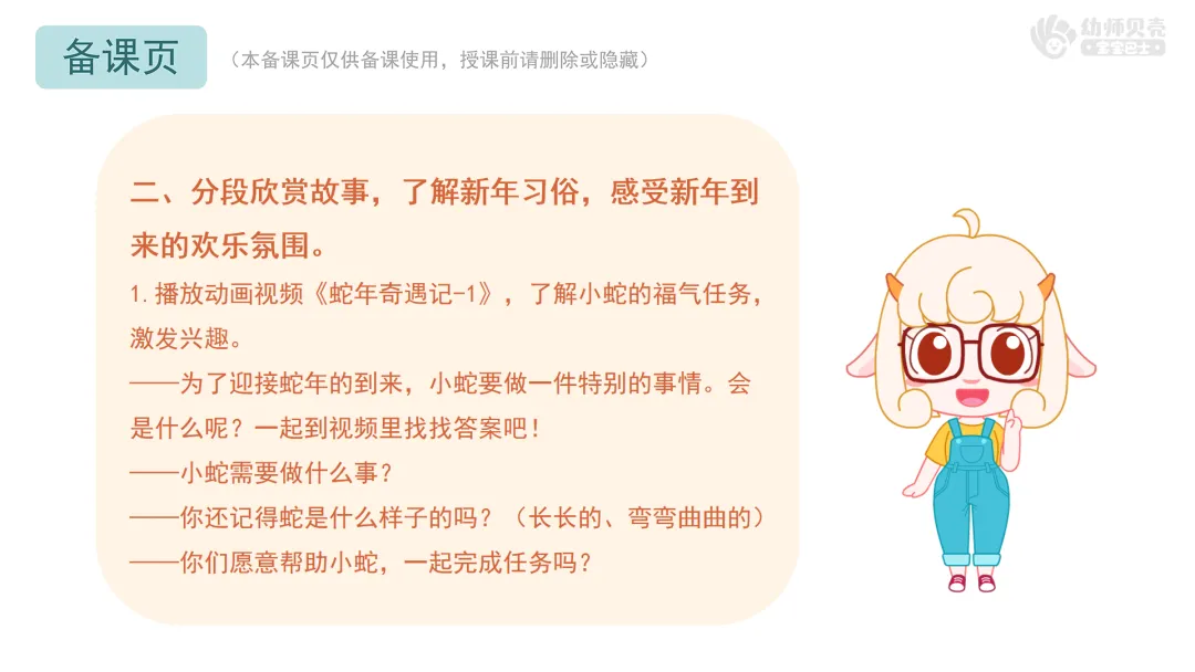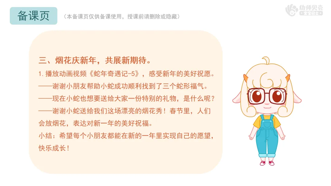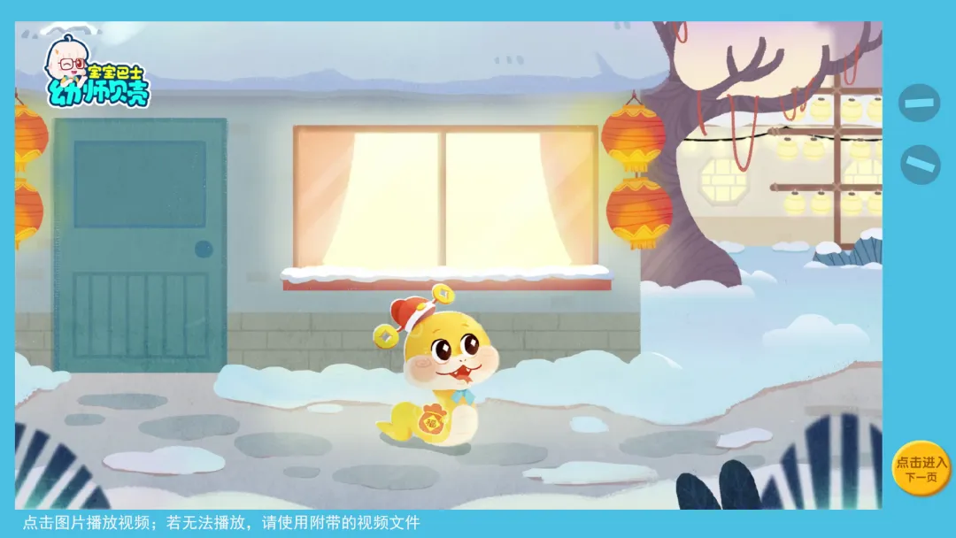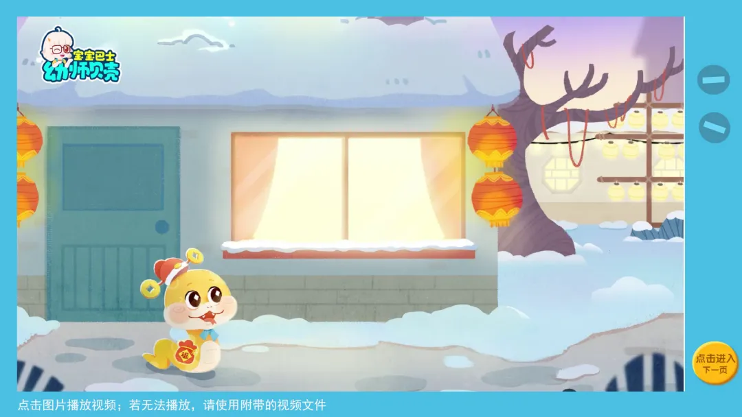 1.播放动画视频《蛇年奇遇记-5》,感受新年的美好祝愿。
