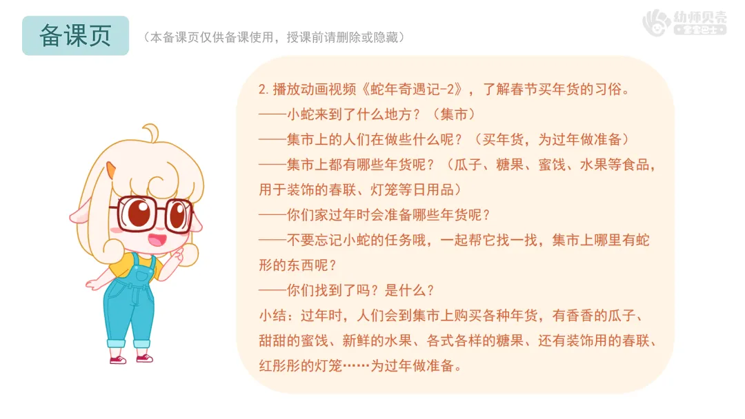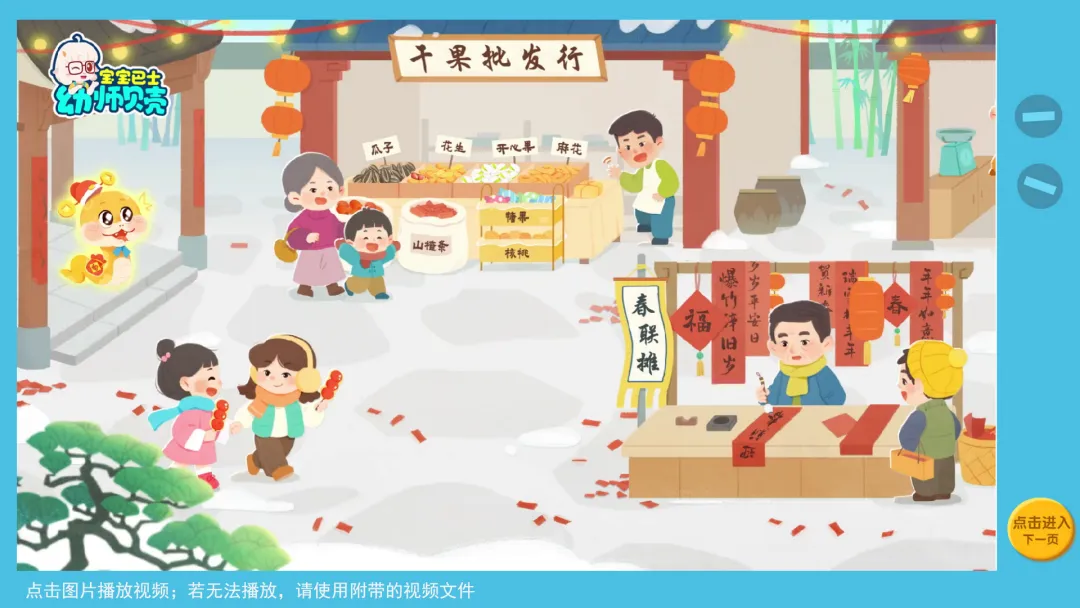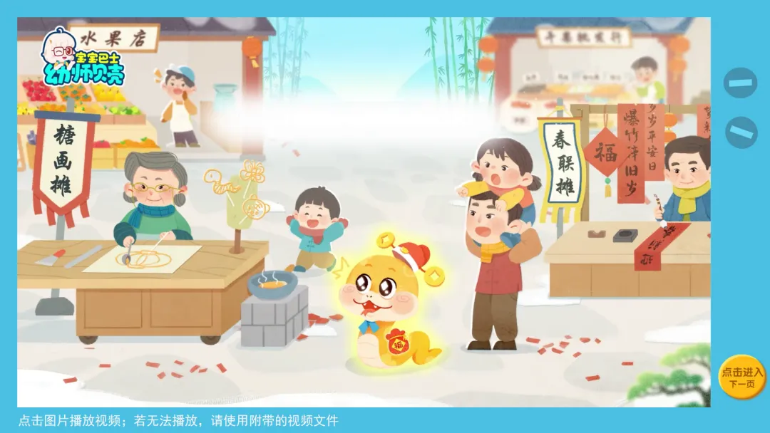 2.播放动画视频《蛇年奇遇记-2》,了解春节买年货的习俗。