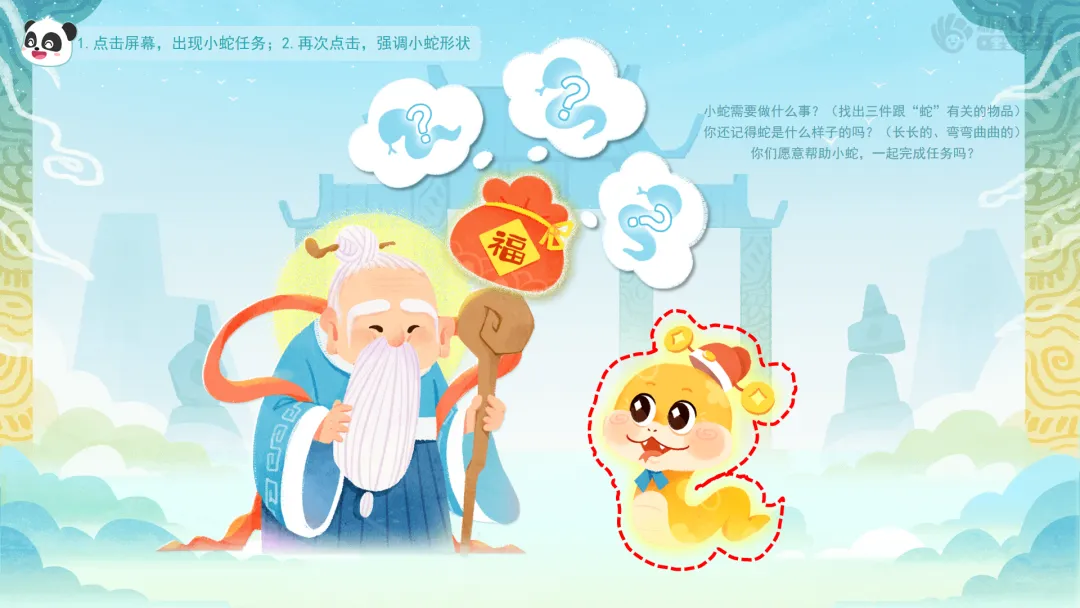 1.播放动画视频《蛇年奇遇记-1》,了解小蛇的福气任务,激发兴趣。