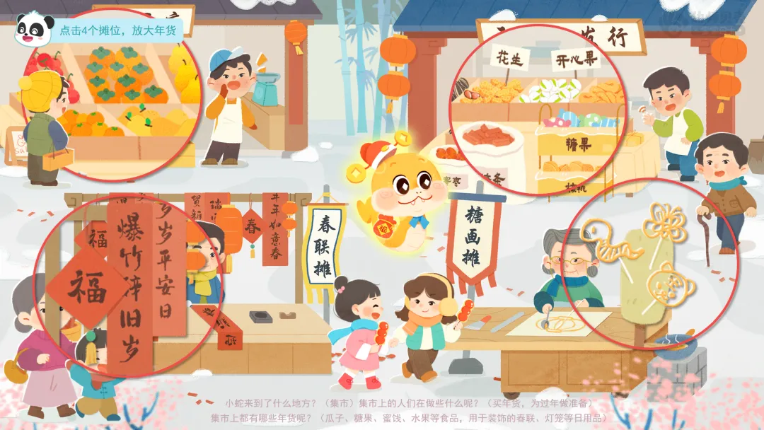 l观察画面,准确找到并说出蛇形物品等春节相关物品。
