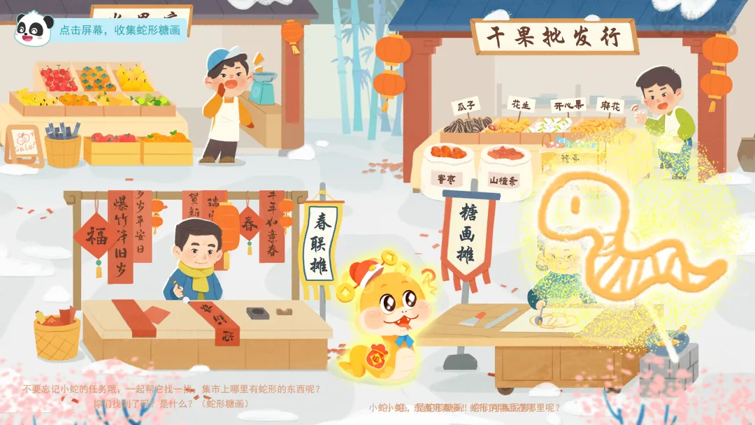 ——收集到了美味的蛇形糖画,小蛇继续往前走,还有什么……在等着它呢?继续欣赏故事吧。——这里也藏着小蛇想要的蛇形福气物品吗?是什么呢?