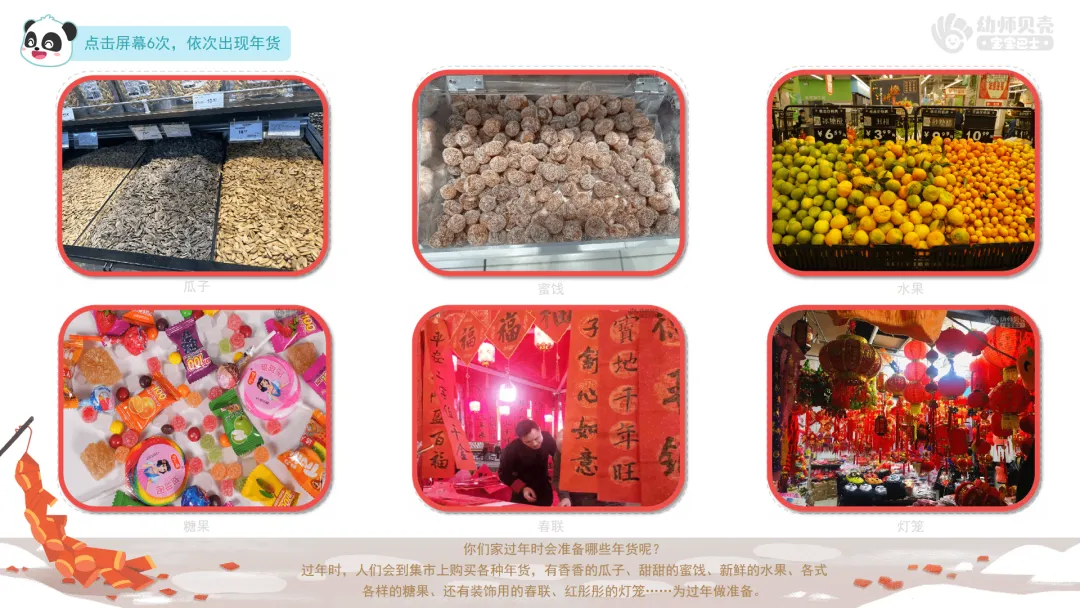 ——你们找到了吗?是什么?(蛇形糖画)小结:过年时,人们会到集市上购买各种年货,有香香的瓜子、甜甜的蜜饯、新鲜的水果、各式各样的糖果、还有装饰用的春联、红彤彤的灯笼……为过年做准备。