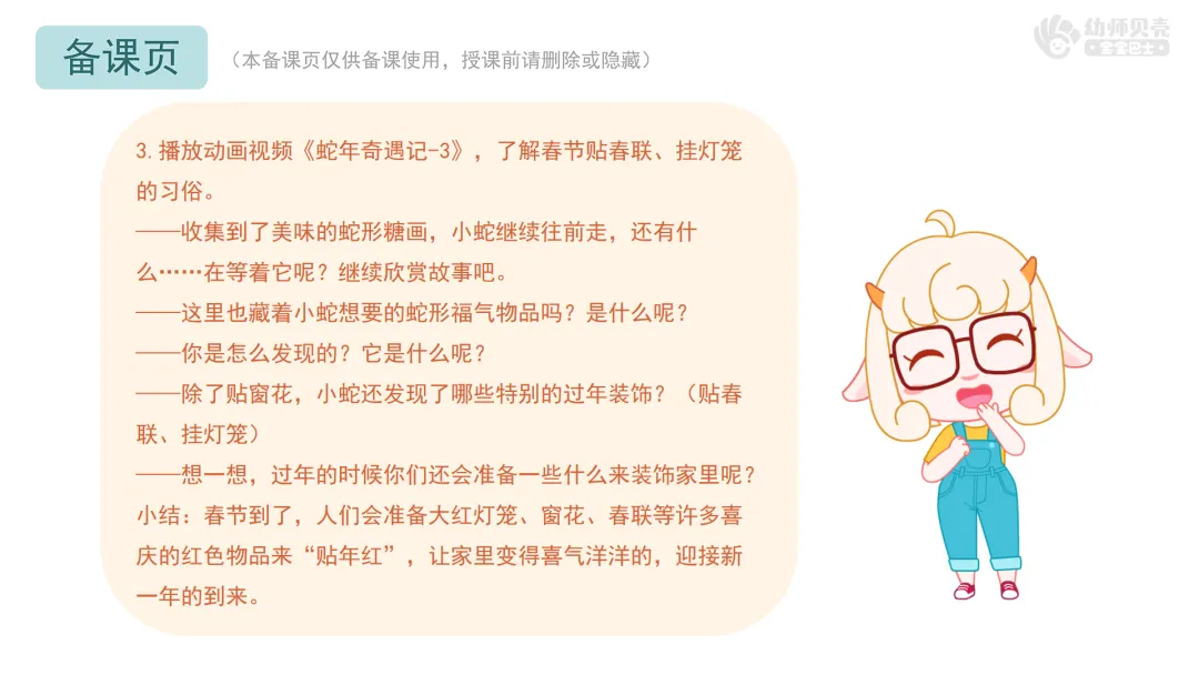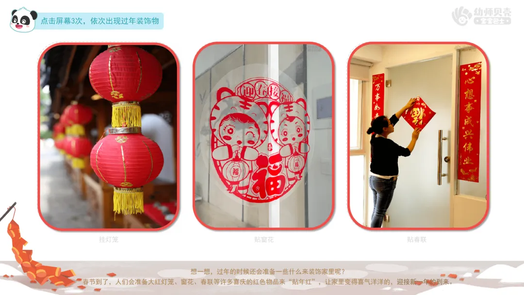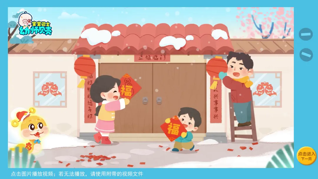 3.播放动画视频《蛇年奇遇记-3》,了解春节贴年红的习俗。