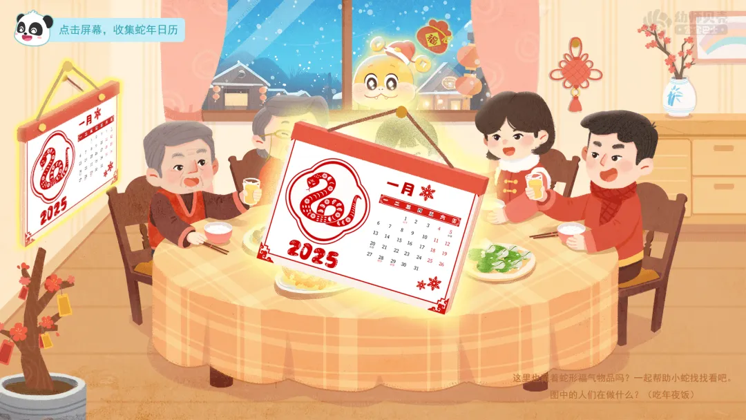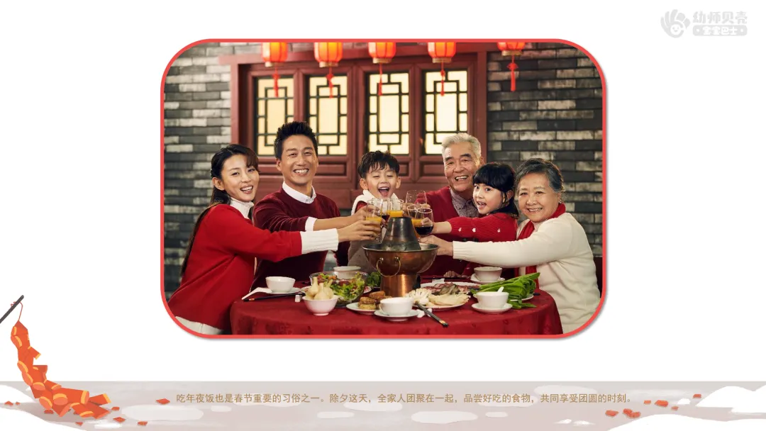 4.播放动画视频《蛇年奇遇记-4》,了解春节吃年夜饭的习俗。