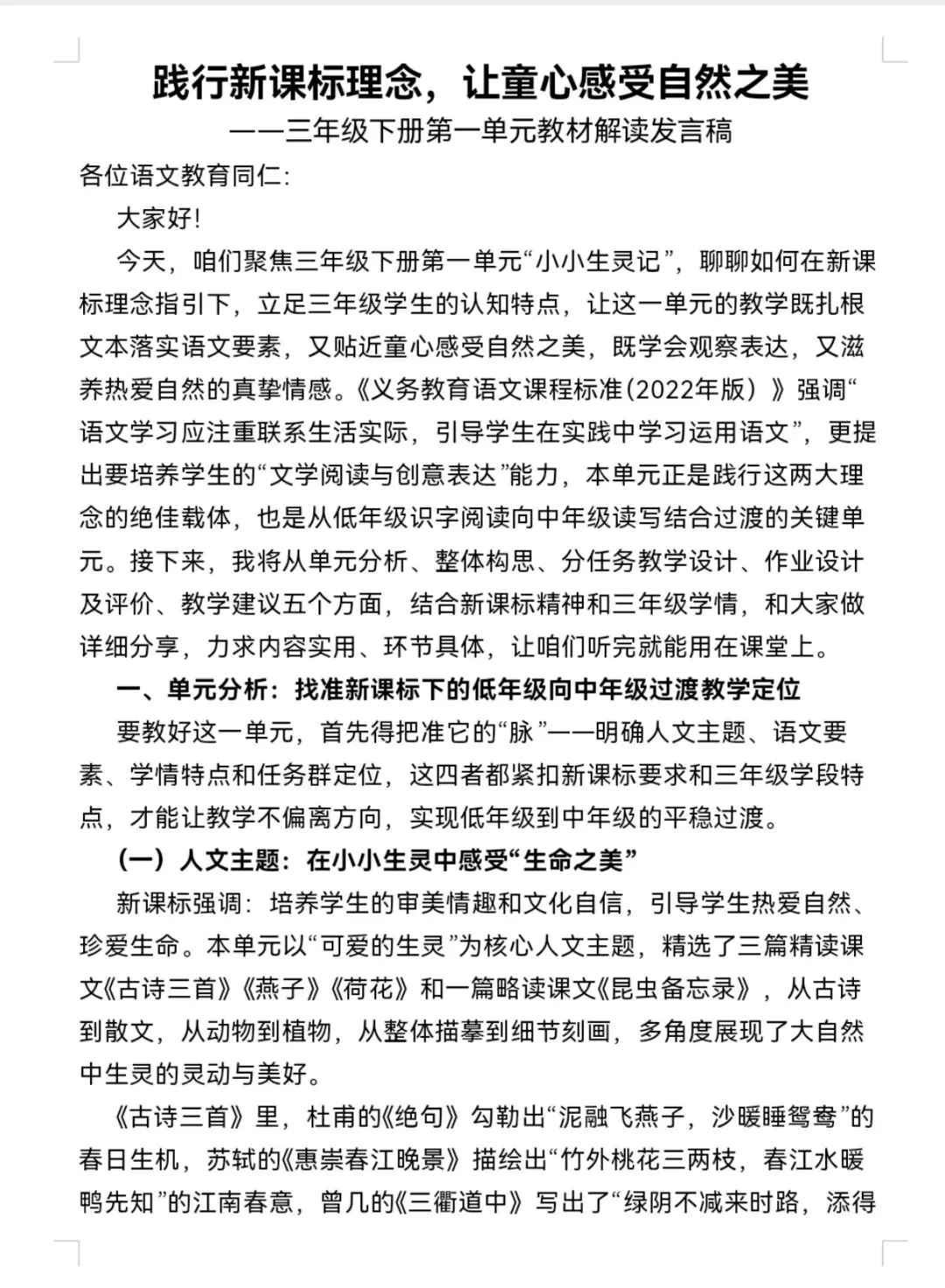 >三年级下册第一单元大单元解读课件+发言稿+大单元教学设计