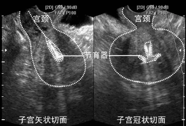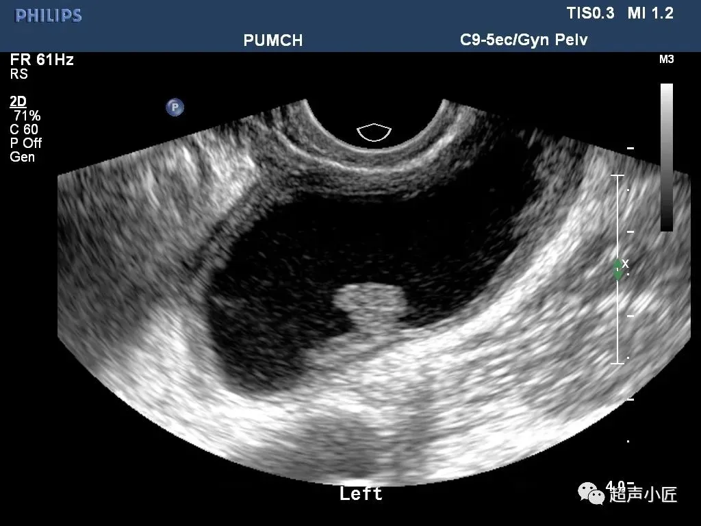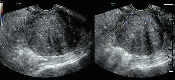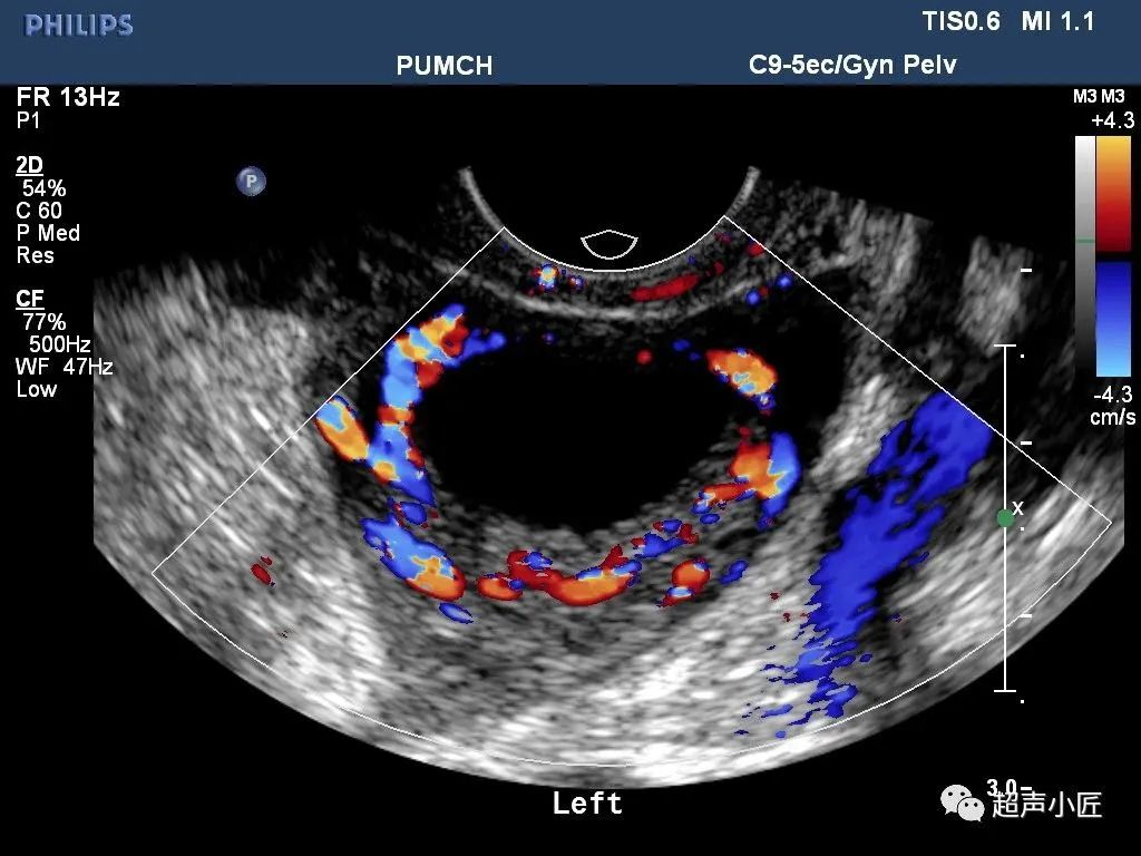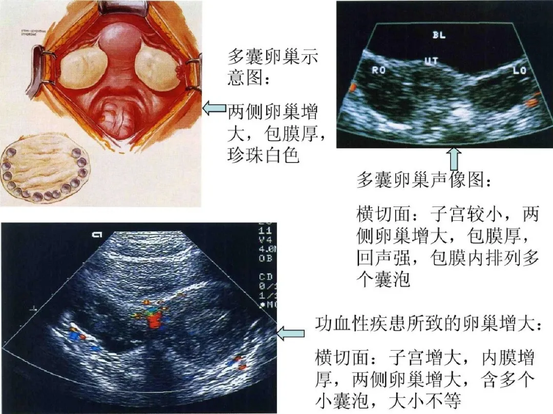 ●多囊卵巢:双侧卵巢均匀增大,形态规整;壁厚光滑,回声增强;显示卵巢内有10多个甚至数十个直径<10mm的囊泡,边界清晰;子宫较小;卵巢动脉血流阻力升高。