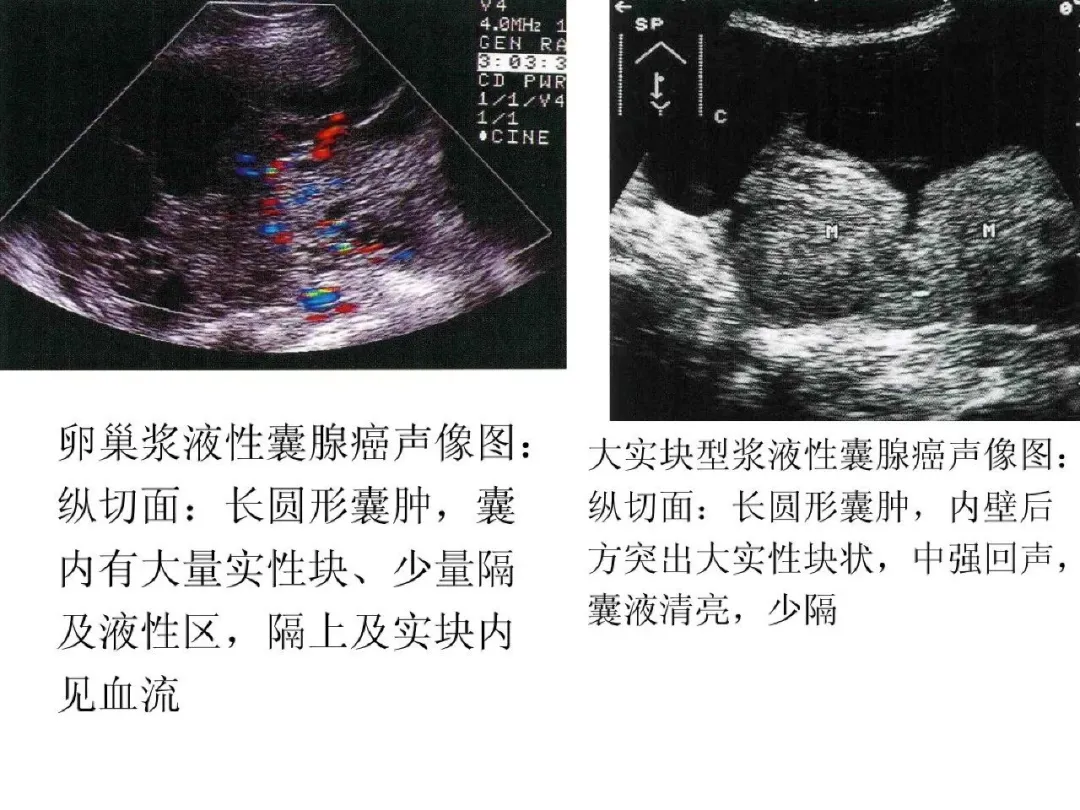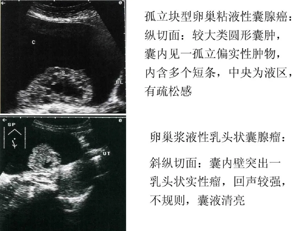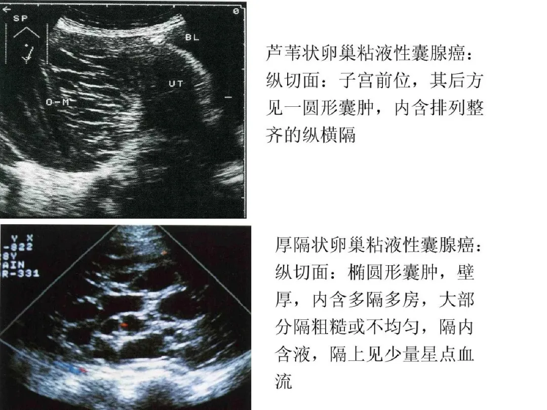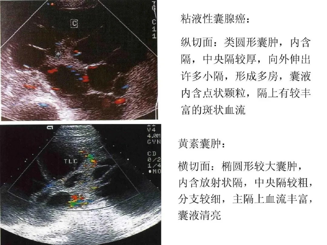 ●黄素囊肿:囊肿较大;呈不规则形、叶状;内部可有分隔,呈车轮状;壁薄而光滑;隔壁上可显示血流信号。