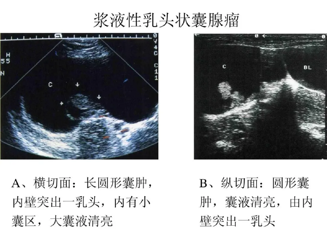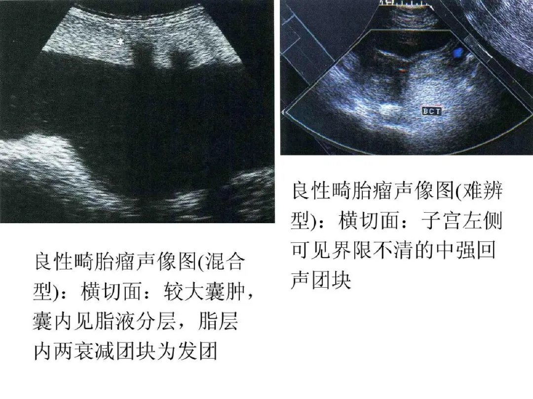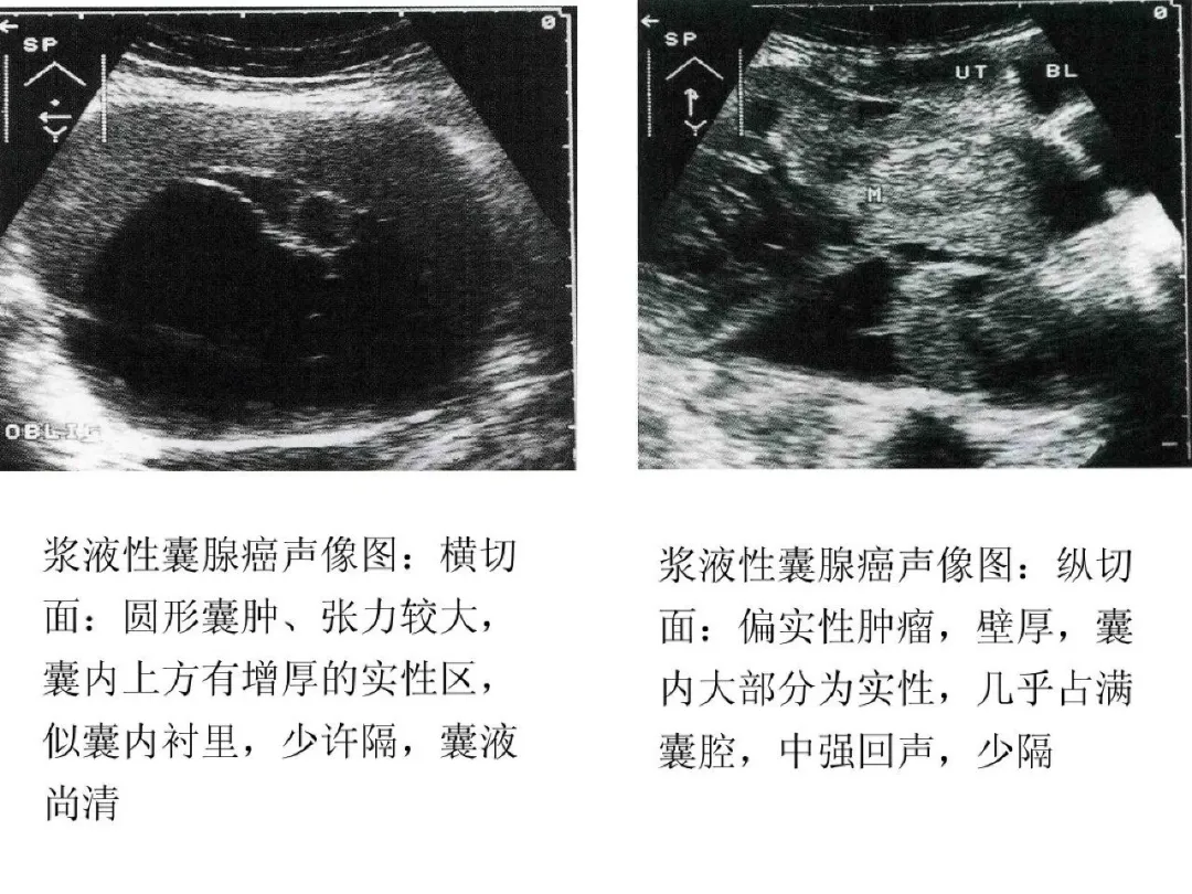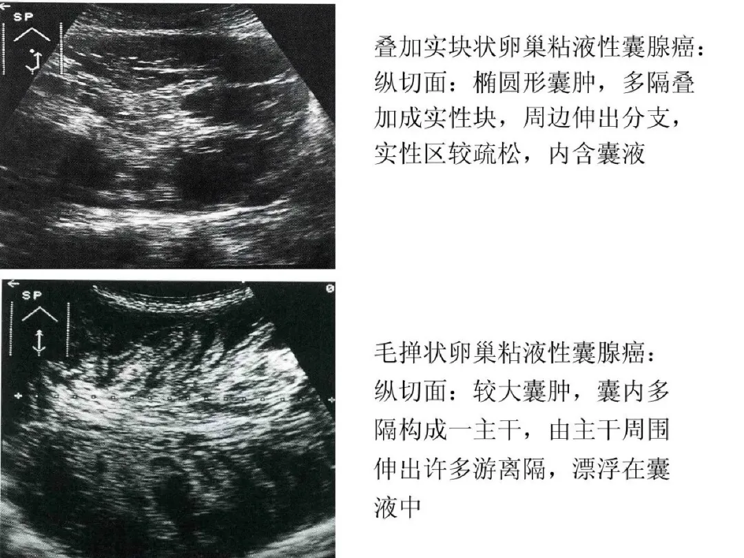 ●黄素囊肿:囊肿较大;呈不规则形、叶状;内部可有分隔,呈车轮状;壁薄而光滑;隔壁上可显示血流信号。