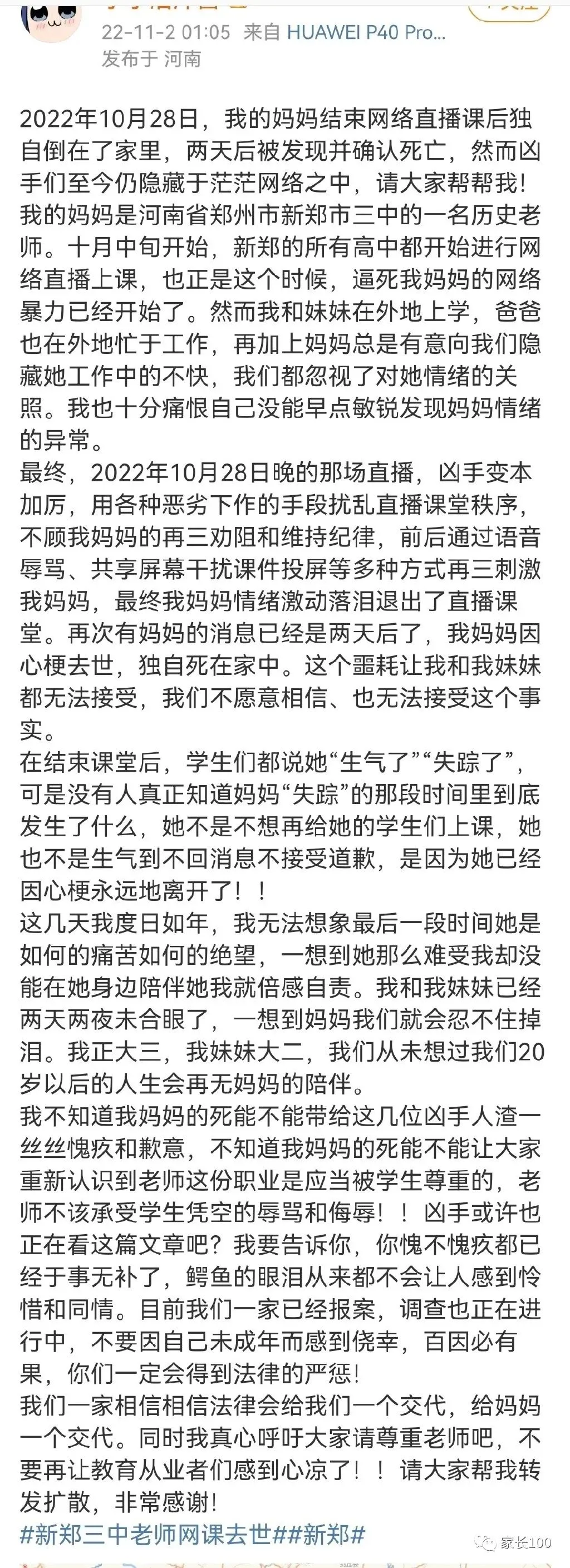 刘老师的女儿发文称:“10月中旬开始,新郑三中开始网络直播上课,也正是这个时候,逼死我妈妈的网络暴力已经开始了。10月28日晚的那场直播,凶手变本加厉,用各种恶劣下作的手段扰乱直播课堂秩序,不顾我妈妈的再三劝阻和维持纪律,前后通过语音辱骂、共享屏幕干扰课件投屏等多种方式再三刺激我妈妈,最终我妈妈情绪激动落泪退出了直播课堂。在结束课堂后,学生们都说她‘生气了’‘失踪了’。”