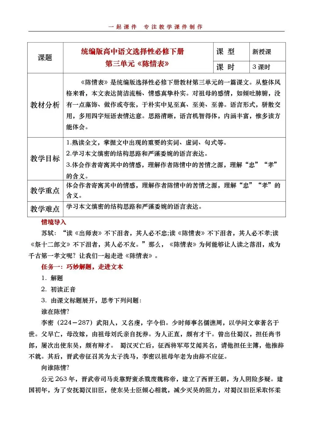 >【一起语文必修下】| 《陈情表》:课件+教学设计