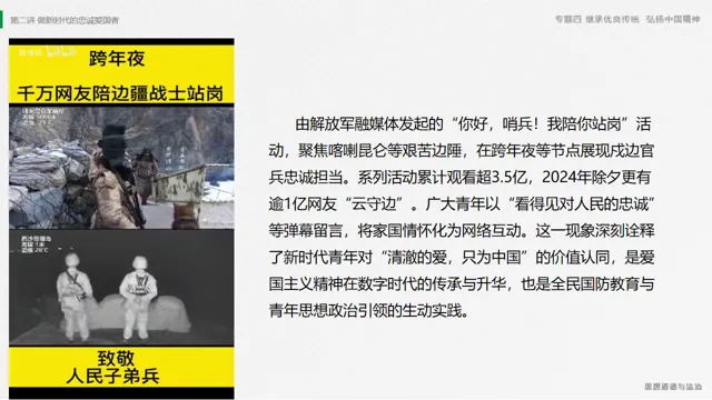 同学们,还有一个现象特别能体现新时代中国青年的精神风貌——那就是每年跨年夜、春节、国庆等节点,千万网友自发涌入直播间,"陪伴"边防战士站岗。