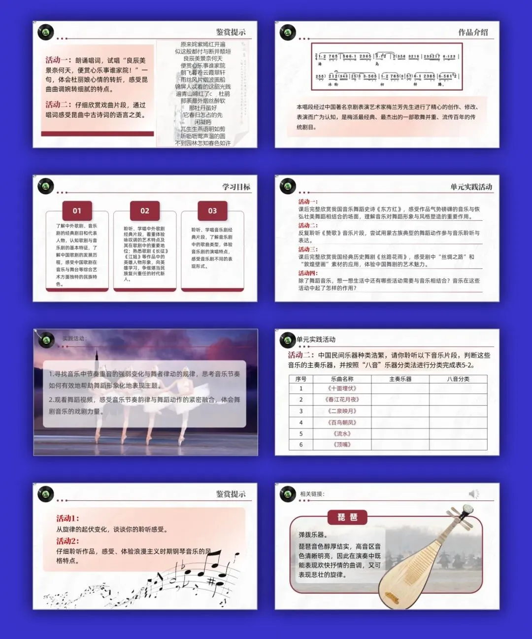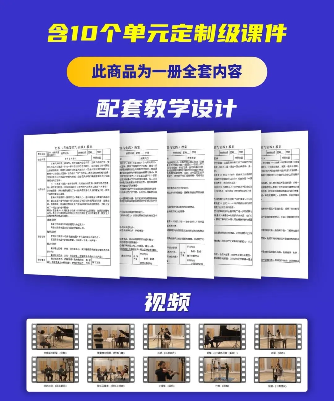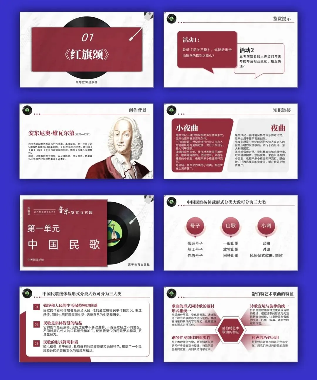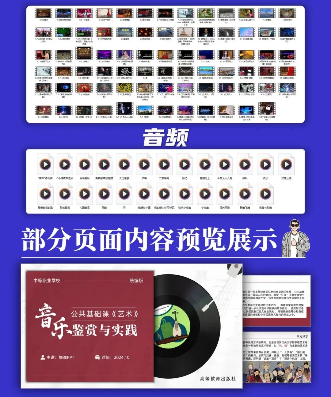 本期统编高教社版中职艺术《音乐鉴赏与实践》,包含10个单元课件PPT,配套教学设计、视频、音频、PPT、教材(扫描版.PDF)。