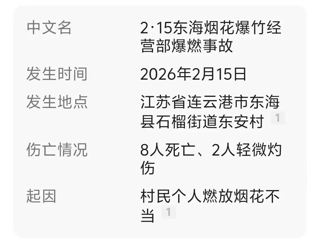 2026年2月15日14时30分许,江苏省连云港市东海县石榴街道东安村因村民个人燃放烟花不当,导致附近一烟花爆竹经营部爆燃,应急、消防、公安、卫健等部门赶赴现场救援处置。当日16时许明火已扑灭,造成8人死亡、2人轻微灼伤。
