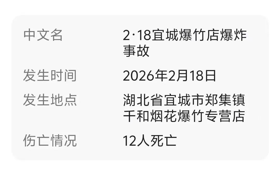 2026年2月18日14时24分,湖北省宜城市郑集镇千和烟花爆竹专营店发生爆燃,过火面积约50平方米,造成12人死亡。