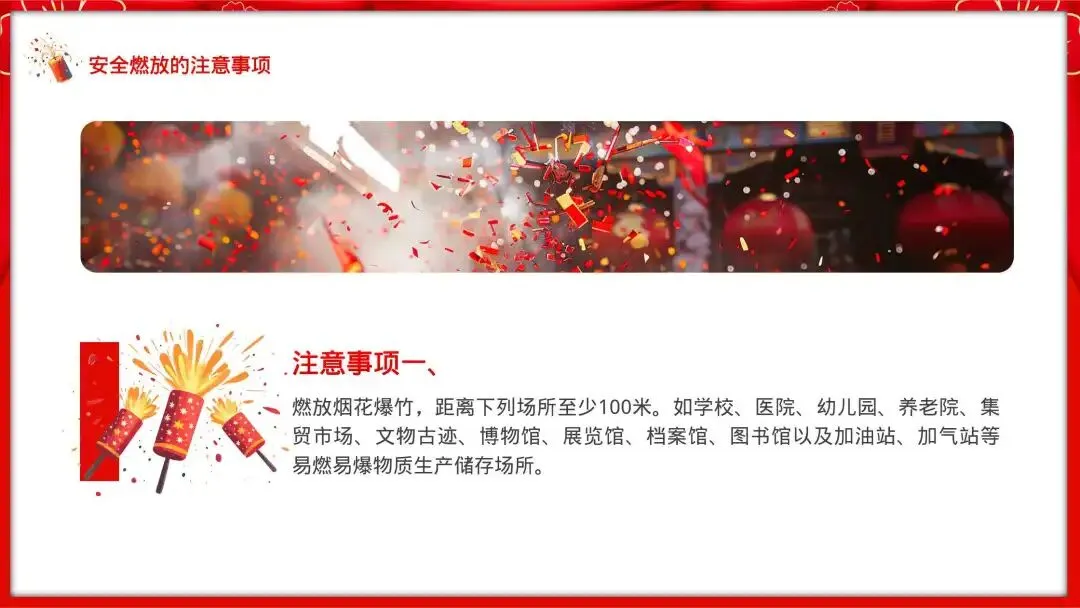 注意事项一:燃放烟花爆竹,距离下列场所至少100米。如学校、医院、幼儿园、养老院、集贸市场、文物古迹、博物馆、展览馆、档案馆、图书馆以及加油站、加气站等易燃易爆物质生产储存场所。