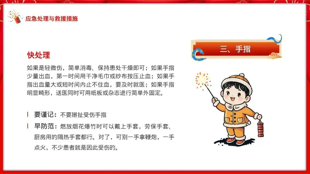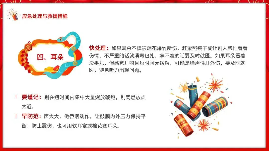 快处理:如果耳朵不慎被烟花爆竹所伤,赶紧照镜子或让别人帮忙看看伤情,不严重的话就消毒包扎,拿不准的话要及时就医。如果耳朵看着没事儿,但感觉耳鸣且短时间无缓解,可能是噪声性耳外伤,要及时就医,避免听力出现问题。