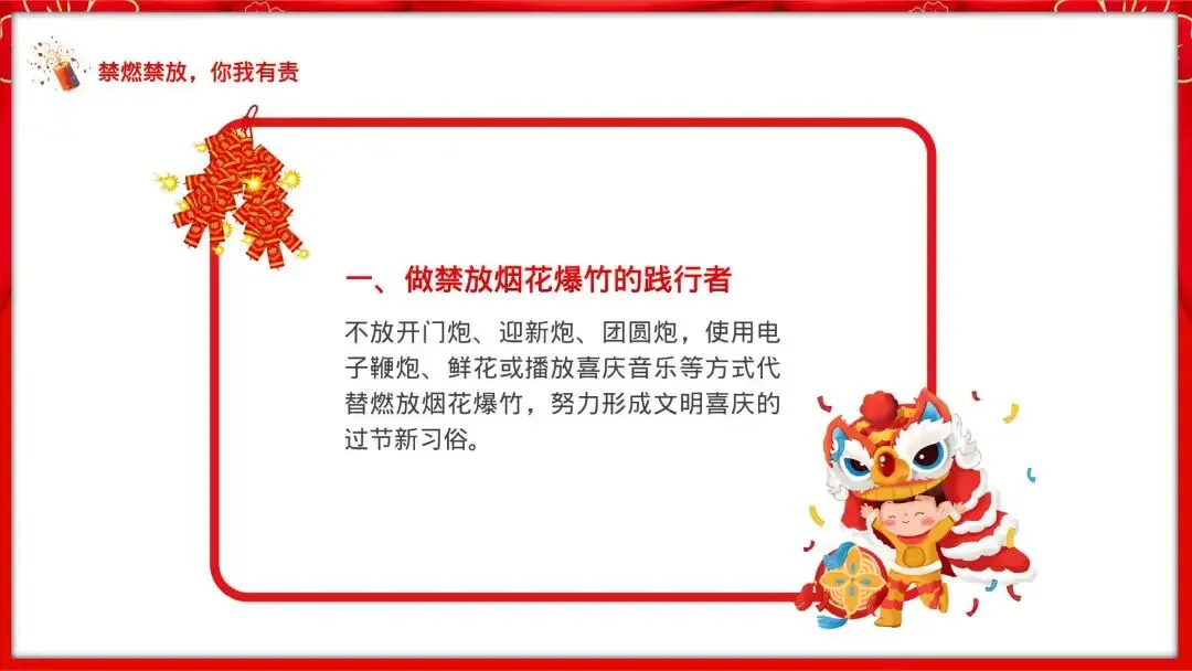 1.做禁放烟花爆竹的践行者:不放开门炮、迎新炮、团圆炮,使用电子鞭炮、鲜花或播放喜庆音乐等方式代替燃放烟花爆竹,努力形成文明喜庆的过节新习俗。