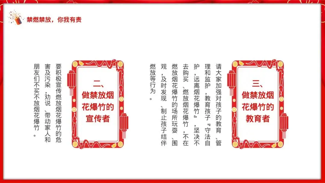 3.做禁放烟花爆竹的教育者:大家加强对孩子的教育、管理和监护,教育孩子“守法自护,远离烟花爆竹”,坚决不去购买、燃放烟花爆竹,不在燃放烟花爆竹的场所玩耍、围观,及时发现、制止孩子结伴燃放等行为。