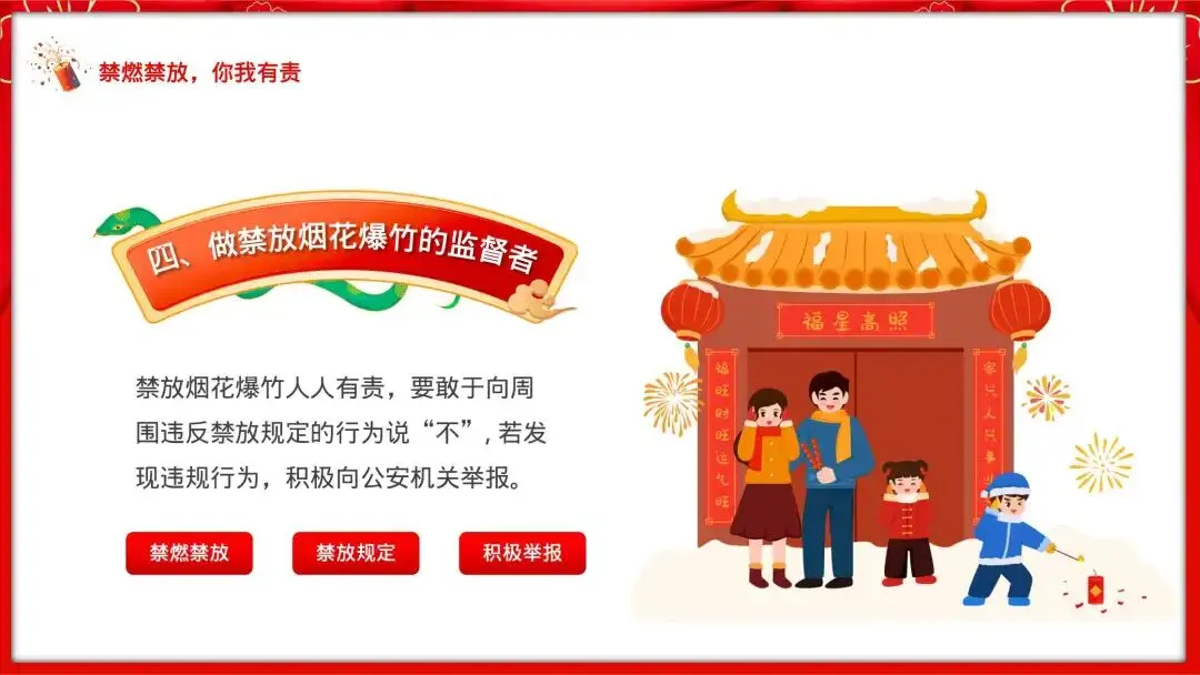 4.做禁放烟花爆竹的监督者:禁放烟花爆竹人人有责,要敢于向周围违反禁放规定的行为说“不”, 若发现违规行为,积极向公安机关举报。