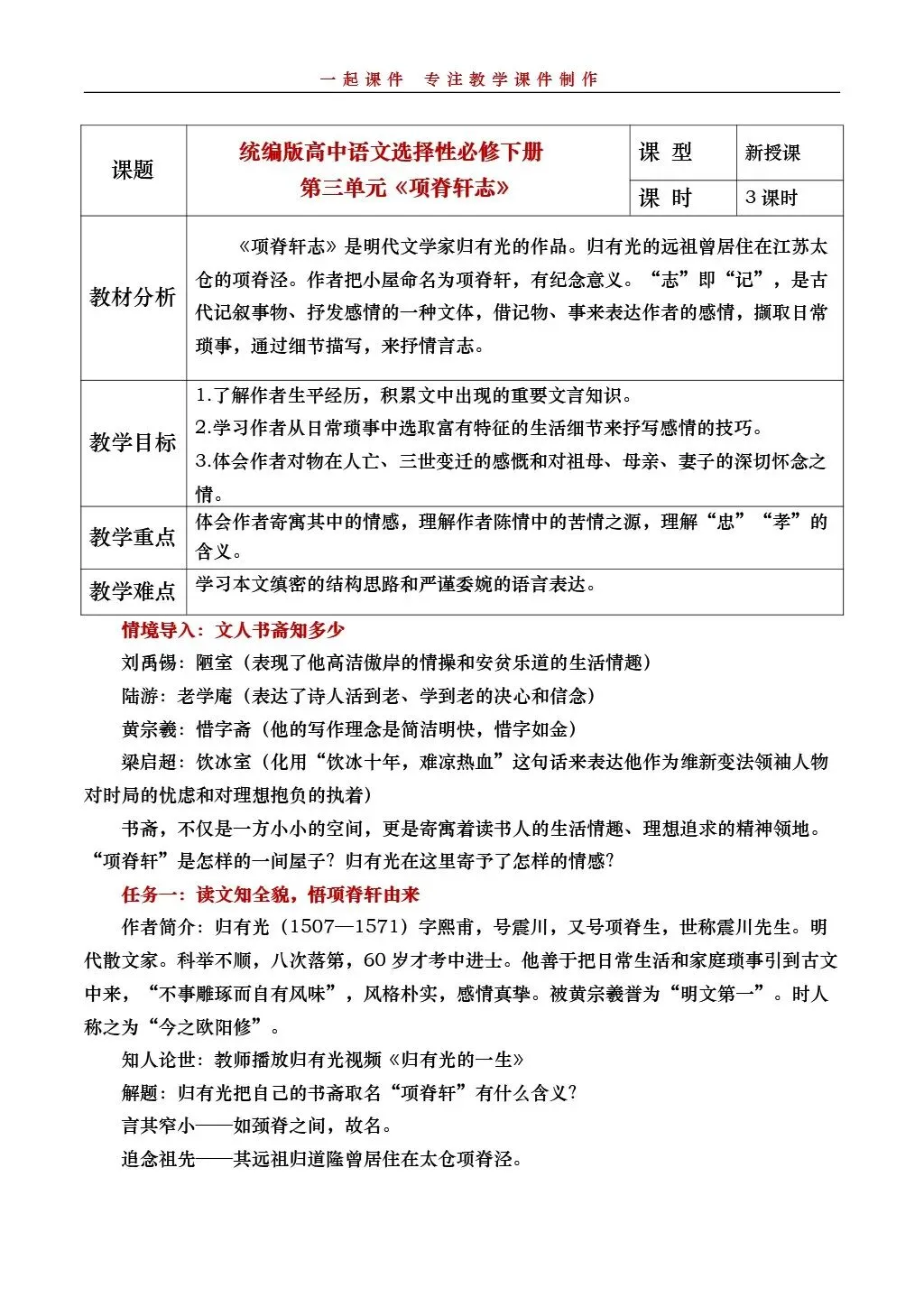 >【一起语文必修下】| 《项脊轩志》:课件+教学设计
