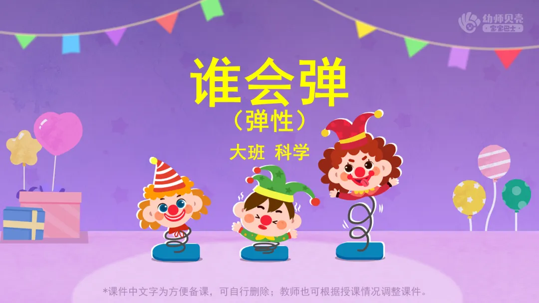 l发放操作材料、出示组图“谁会弹”,鼓励幼儿区分有弹性和无弹性的物品,进一步感知弹性现象。
