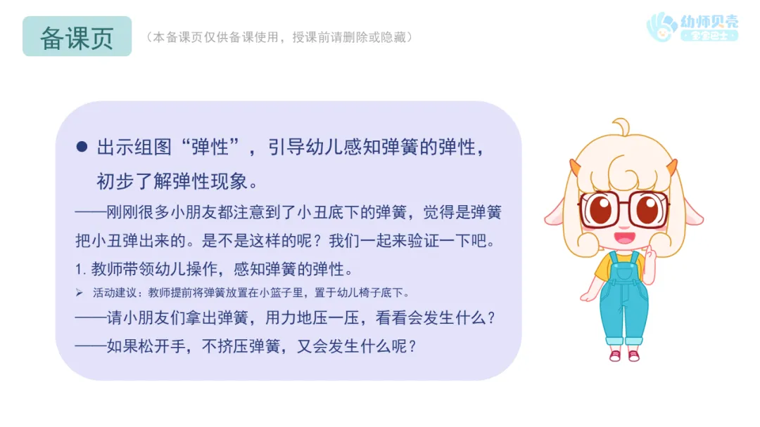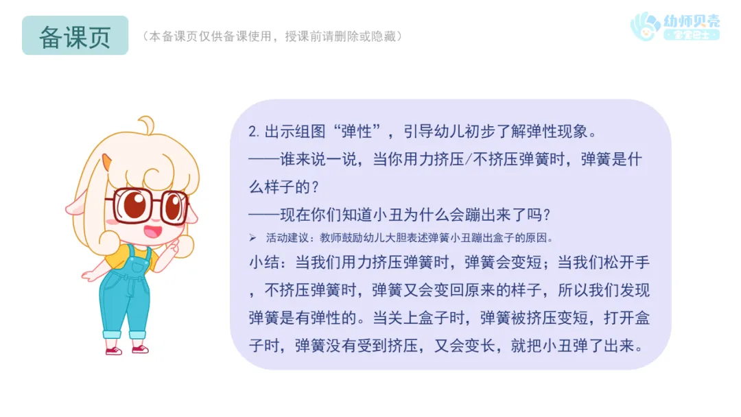 Ø活动建议:教师鼓励幼儿大胆表述弹簧小丑蹦出盒子的原因。