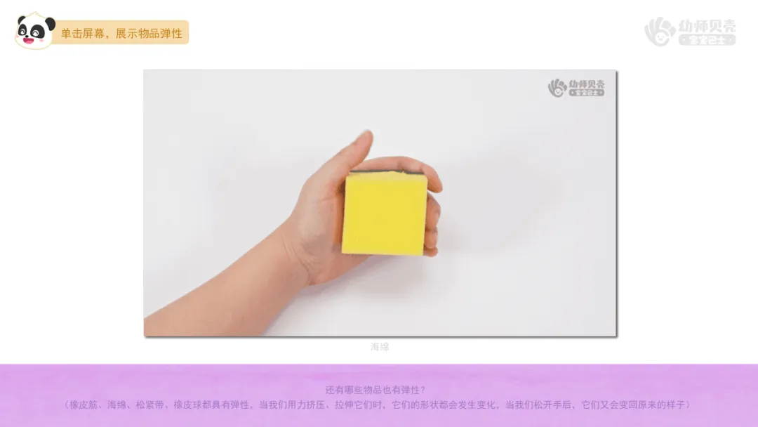 ——当我们用力挤压海绵时,海绵会变扁;当我们松开手,海绵又变回了原样。所以海绵具有弹性。