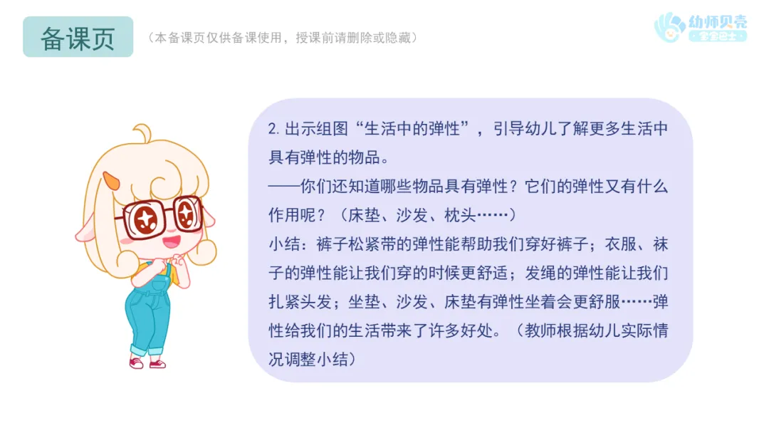 小结:裤子松紧带的弹性能帮助我们穿好裤子;衣服、袜子的弹性能让我们穿的时候更舒适;发绳的弹性能让我们扎紧头发;坐垫、沙发、床垫有弹性坐着会更舒服……弹性给我们的生活带来了许多好处。(教师根据幼儿实际情况调整小结)