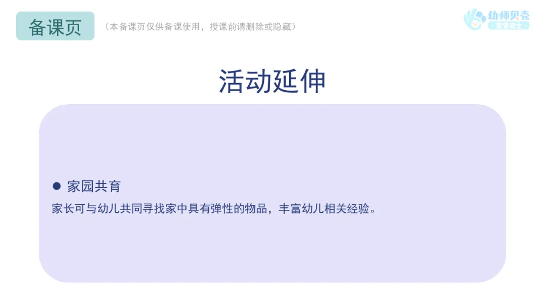 Ø活动建议:教师可以请幼儿在集体前展示自己找到的有弹性的物品并试着说一说该物品的弹性带来的好处。
