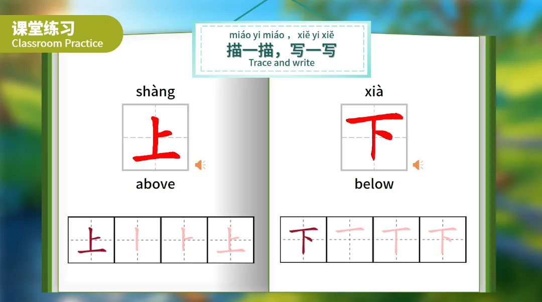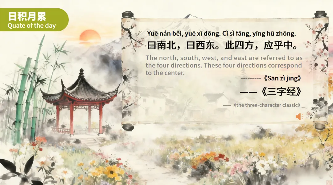 最后,“日积月累”部分展示了经典古籍《三字经》中的语句“曰南北,曰西东。此四方,应乎中”,并配有精美的水墨画背景,让学生们在积累汉语知识的同时,感受中国传统文化的博大精深。