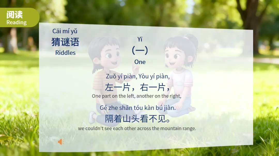 展示了谜面“左一片,右一片,隔着山头看不见”及其英文翻译,谜底则是本节课所学的生字相关词语。