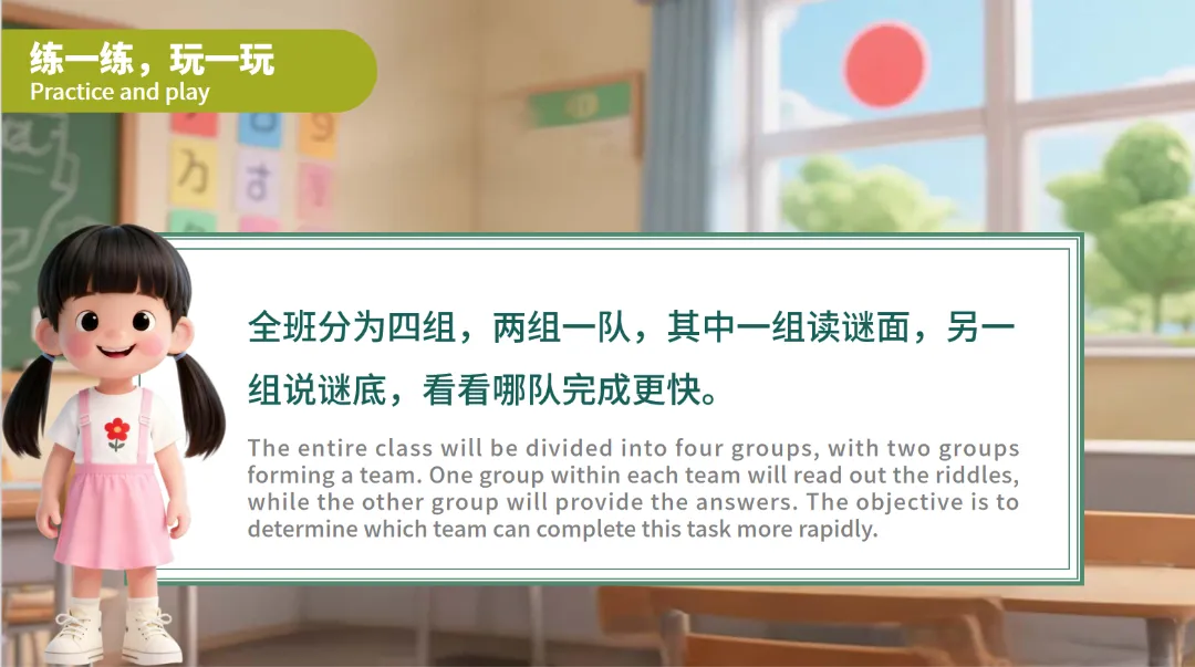 此外,课件还有“练一练,玩一玩”环节,全班分为四组进行猜谜语比赛,两组一队,一组读谜面,另一组说谜底,看看哪队完成更快。