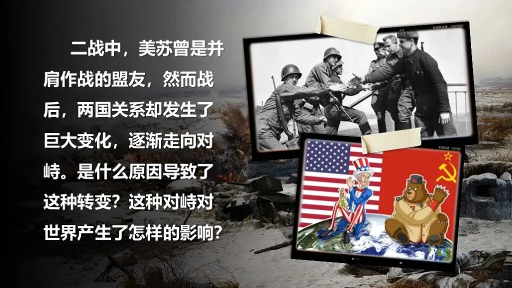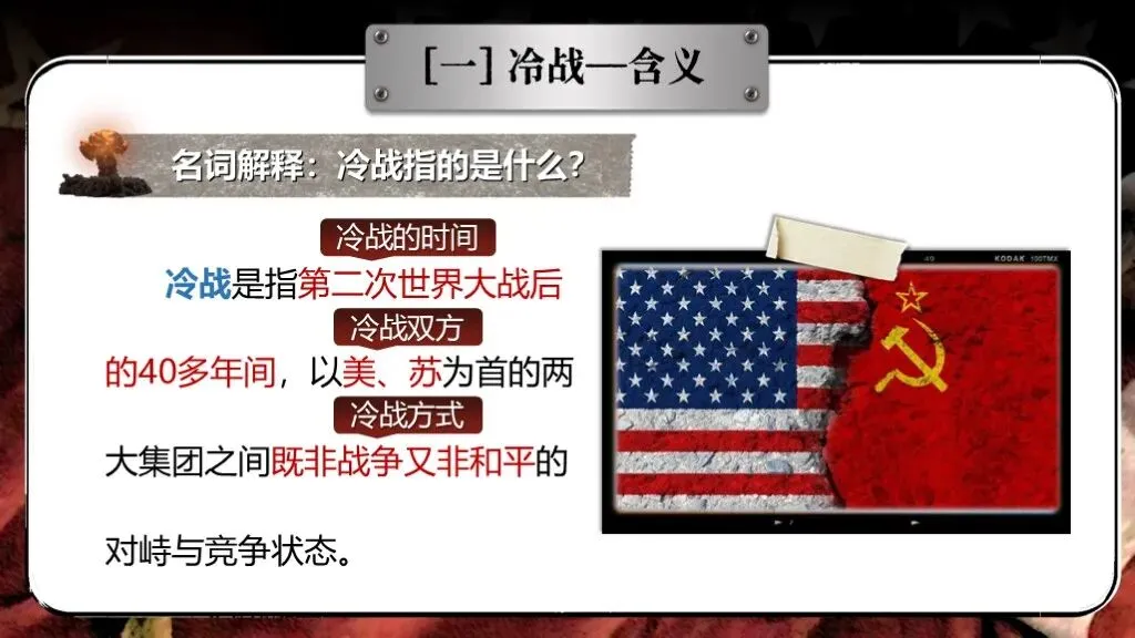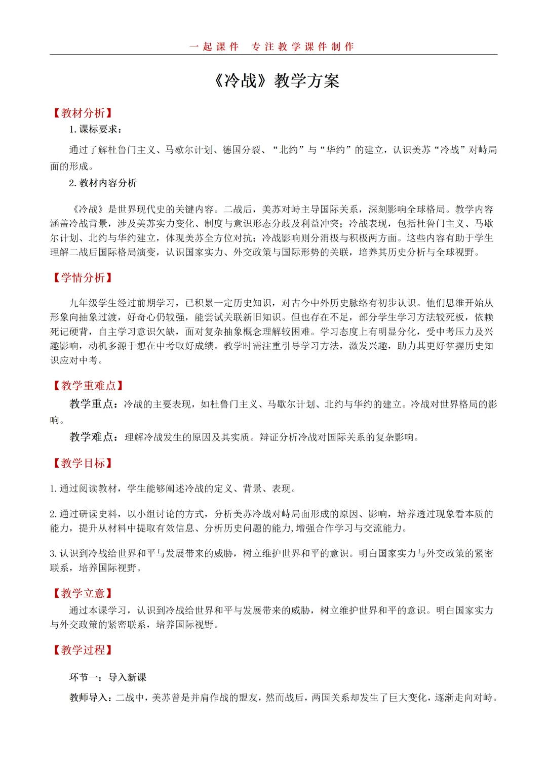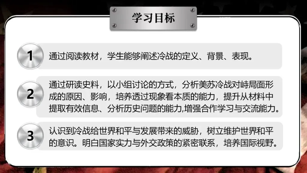 《冷战》是世界现代史的关键内容。二战后,美苏对峙主导国际关系,深刻影响全球格局。教学内容涵盖冷战背景,涉及美苏实力变化、制度与意识形态分歧及利益冲突;冷战表现,包括杜鲁门主义、马歇尔计划、北约与华约建立,体现美苏全方位对抗;冷战影响则分消极与积极两方面。这些内容有助于学生理解二战后国际格局演变,认识国家实力、外交政策与国际形势的关联,培养其历史分析与全球视野。