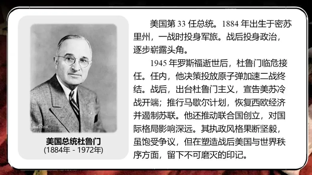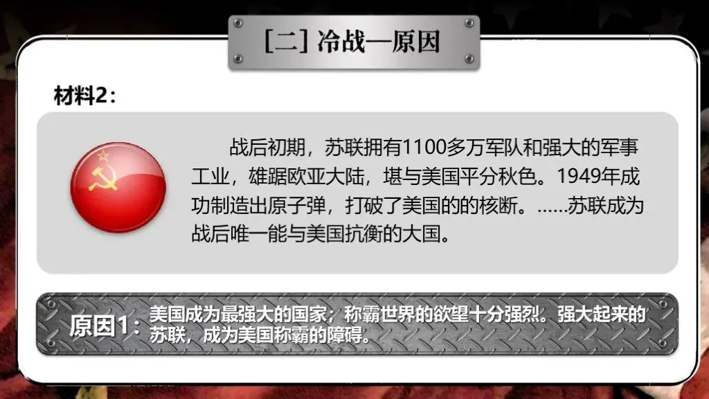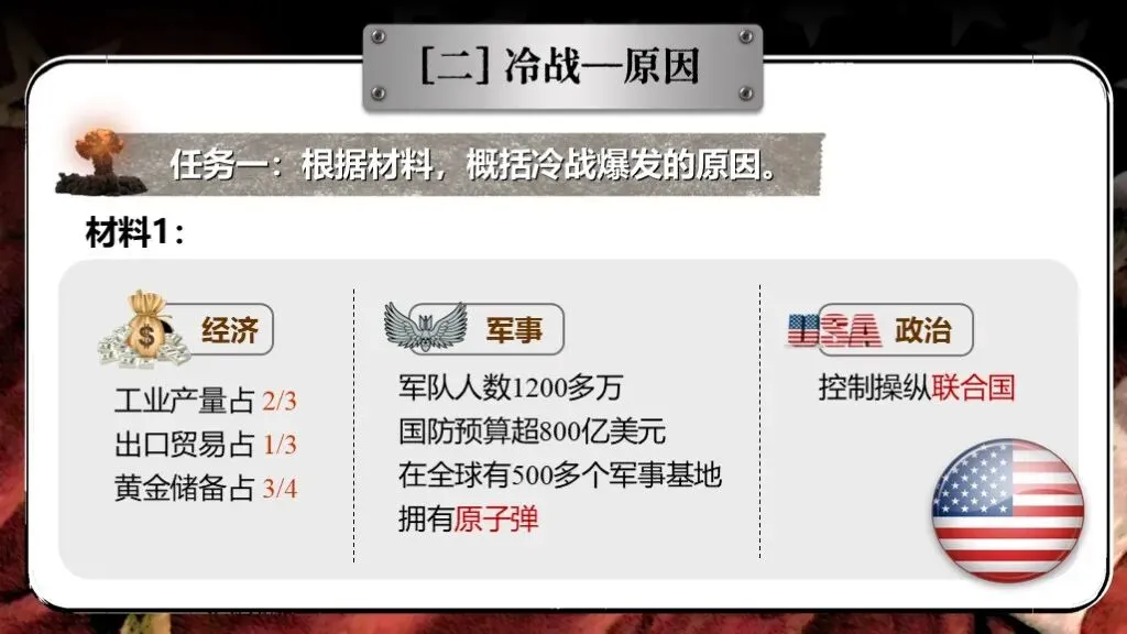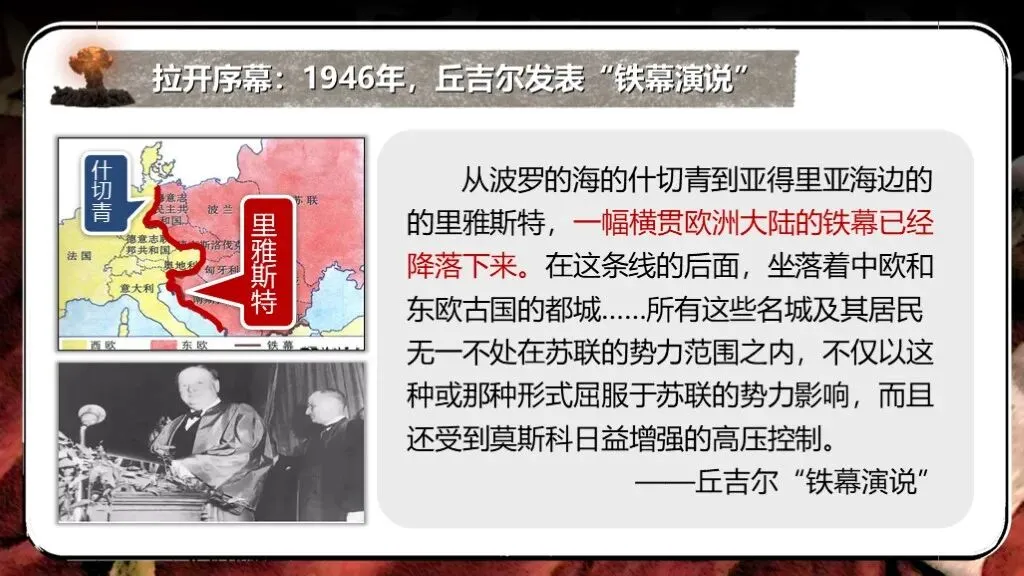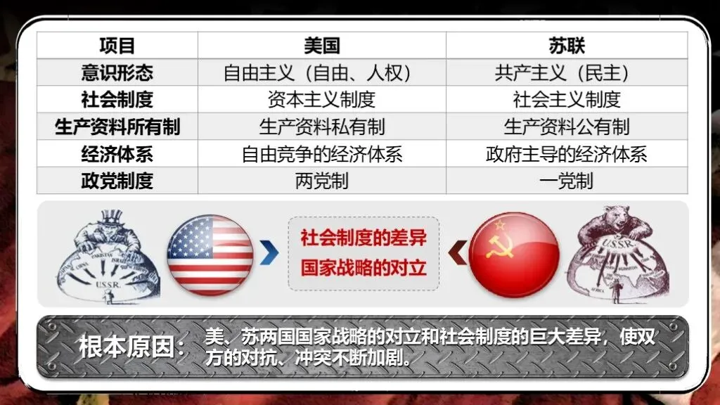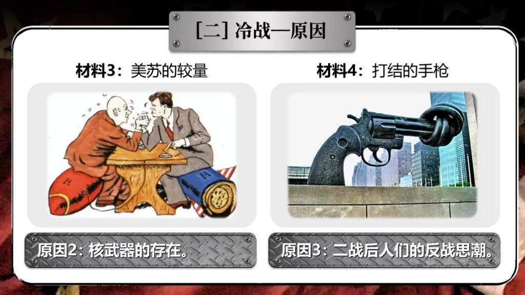 《冷战》是世界现代史的关键内容。二战后,美苏对峙主导国际关系,深刻影响全球格局。教学内容涵盖冷战背景,涉及美苏实力变化、制度与意识形态分歧及利益冲突;冷战表现,包括杜鲁门主义、马歇尔计划、北约与华约建立,体现美苏全方位对抗;冷战影响则分消极与积极两方面。这些内容有助于学生理解二战后国际格局演变,认识国家实力、外交政策与国际形势的关联,培养其历史分析与全球视野。