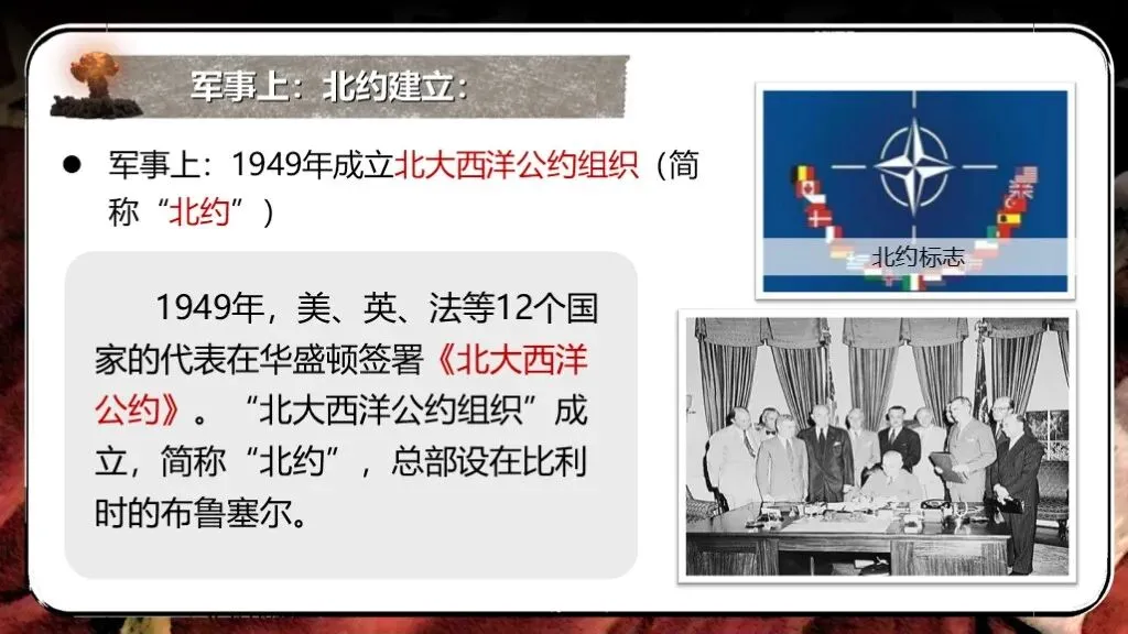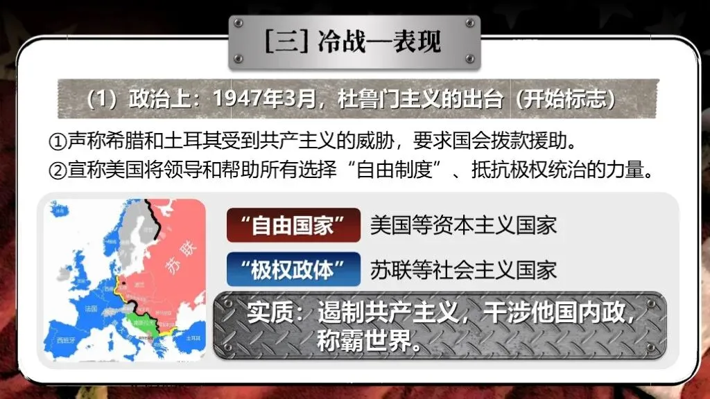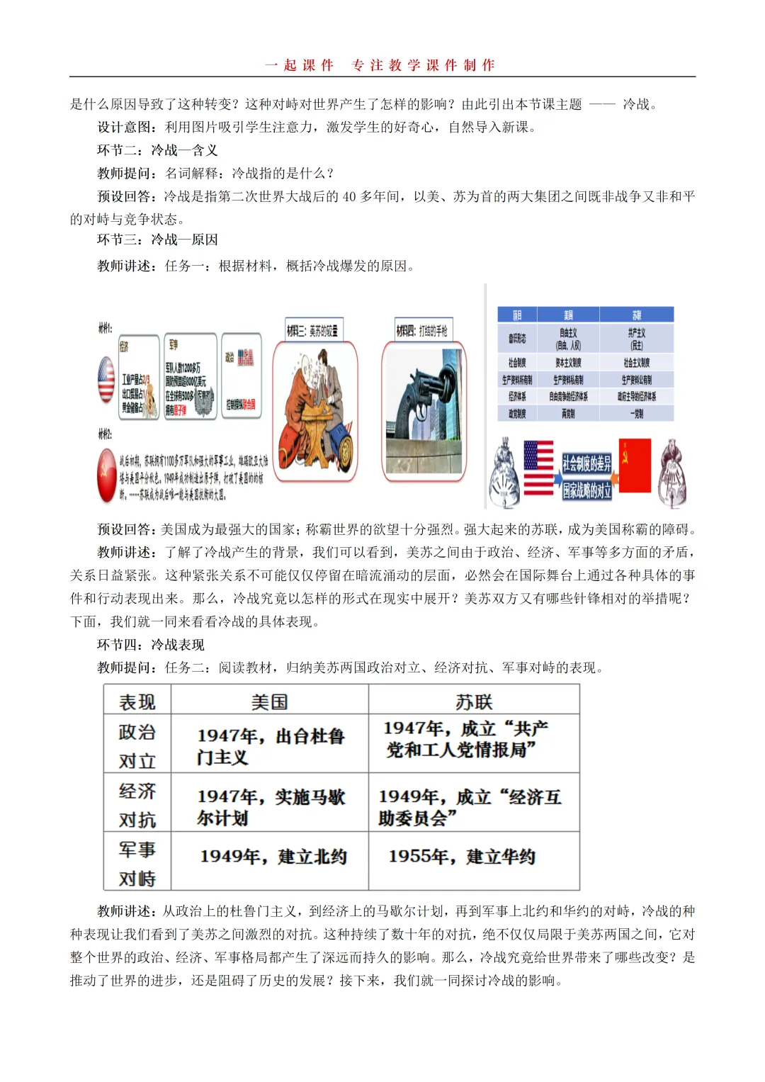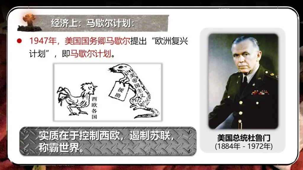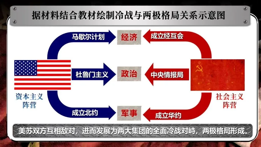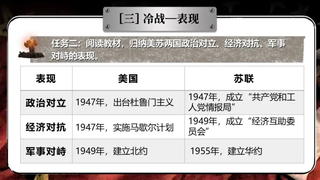 通过了解杜鲁门主义、马歇尔计划、德国分裂、“北约”与“华约”的建立,认识美苏“冷战”对峙局面的形成。