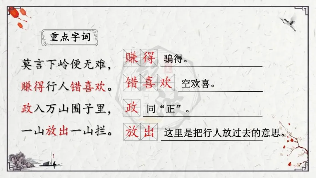 (2)表颜色的词:颜色一般表现心情,增强描写的色彩感和画面感,渲染气氛。欣赏时,或抓住能表现色彩组合的字眼,体会诗歌的浓郁的画意与鲜明的节奏:“两个黄鹂鸣翠柳,一行白鹭上青天”,黄、翠、白、青四种颜色,点缀得错落有致,而且由点到线,向着无限的空间延伸,画面静中有动,富有鲜明的立体节奏感。