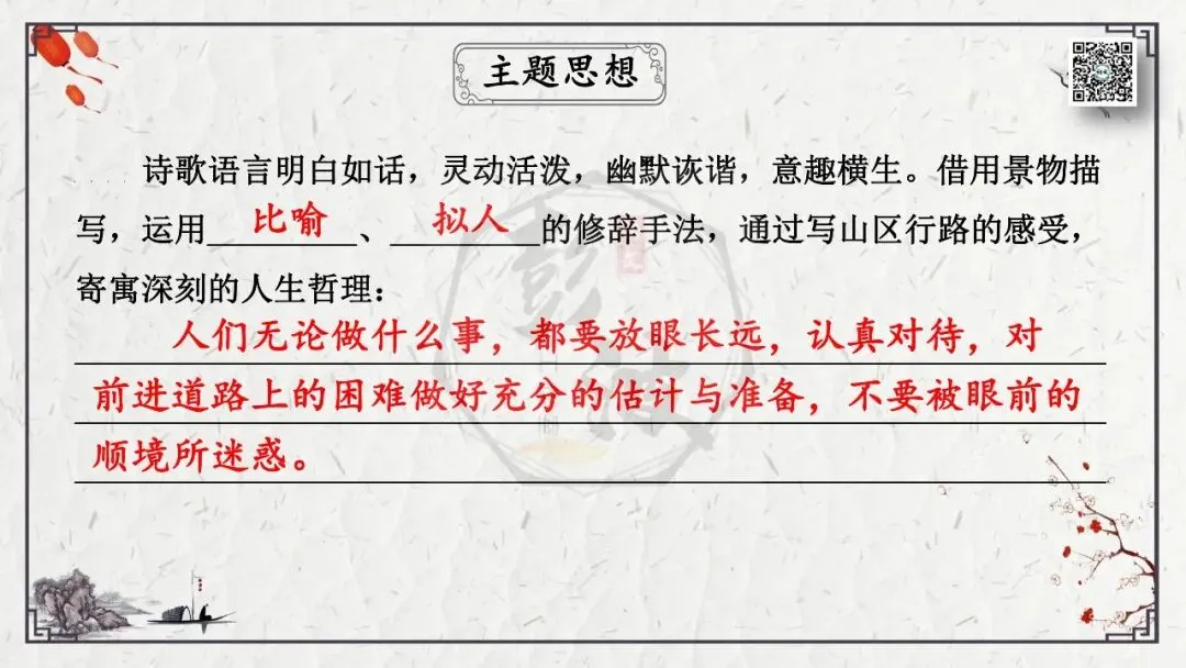 2、结构形式:诗歌的结构形式,常见的首尾照应,开门见山、层层深入,先总后分,先景后情、卒章显志,过渡、铺垫、伏笔等。