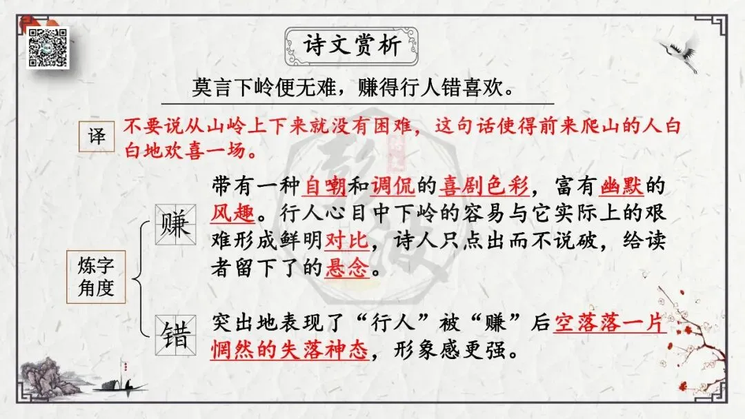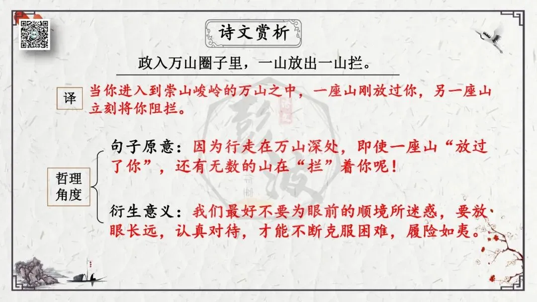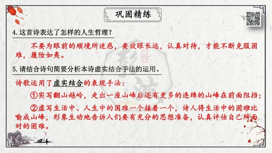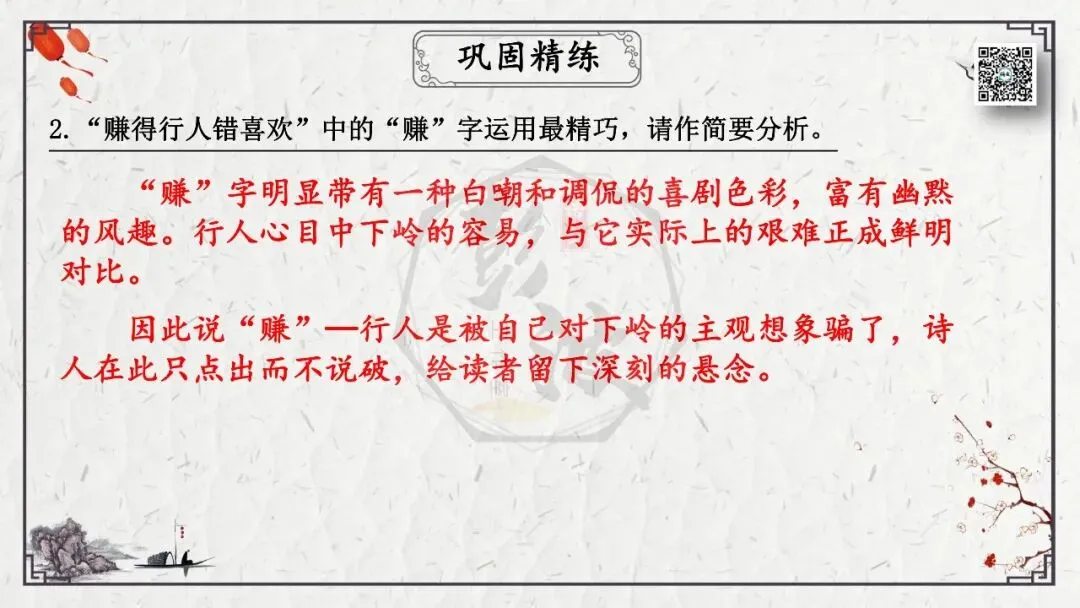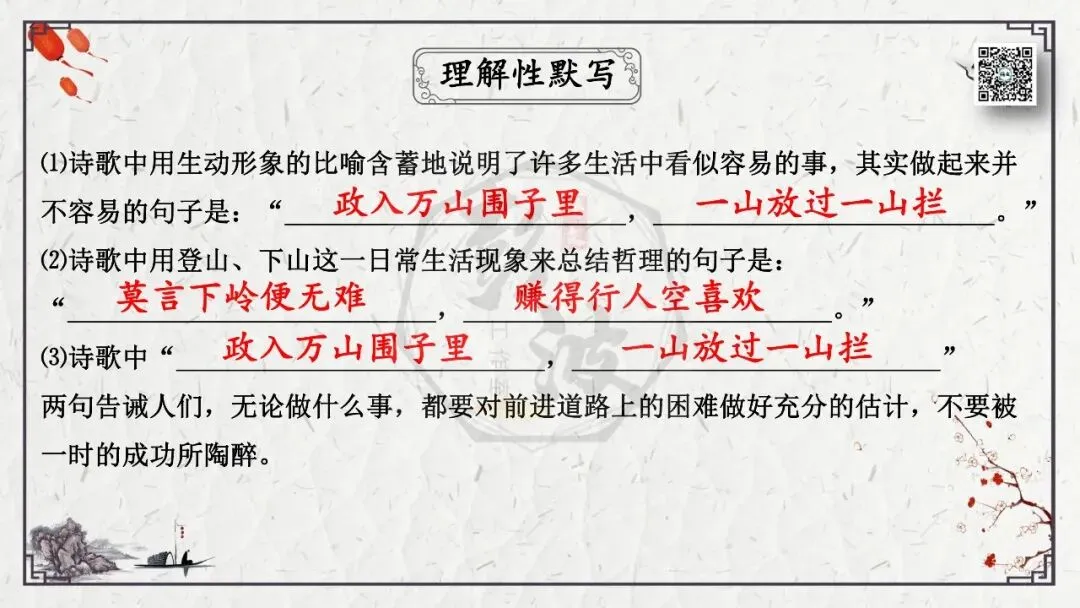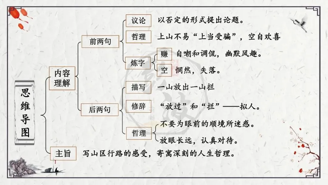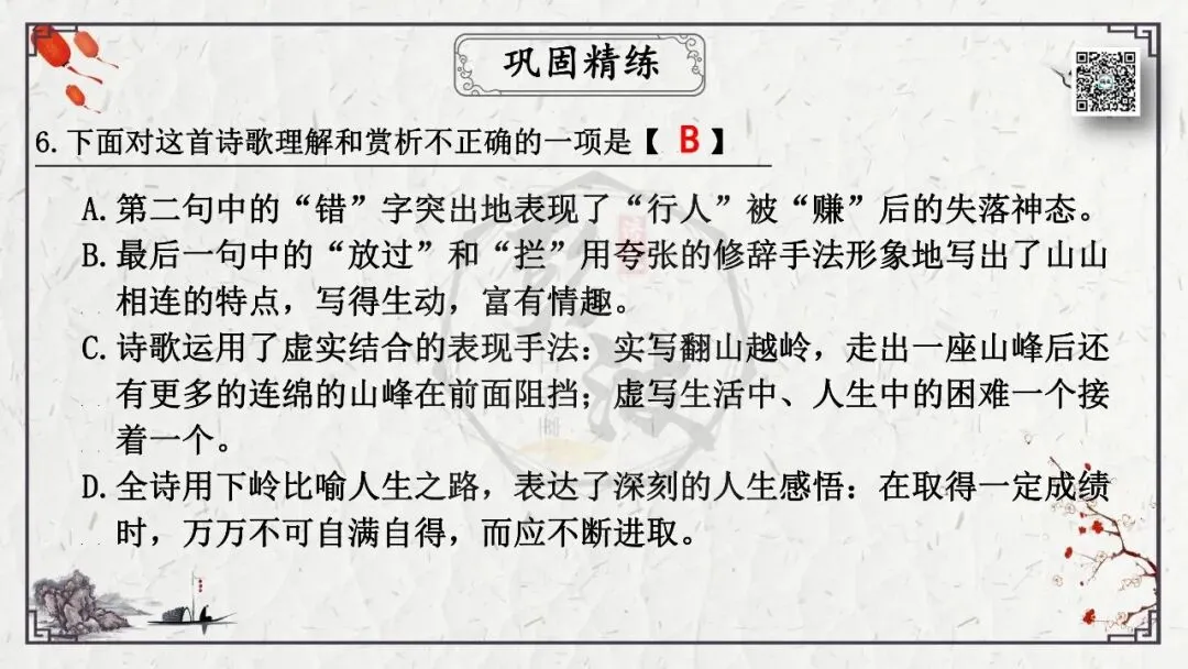 2、理解诗意。这是从思想内容角度考查理解能力,包括诗词字词句的理解,内容的归纳概括,哲理的分析,作品的思想感情倾向等。
